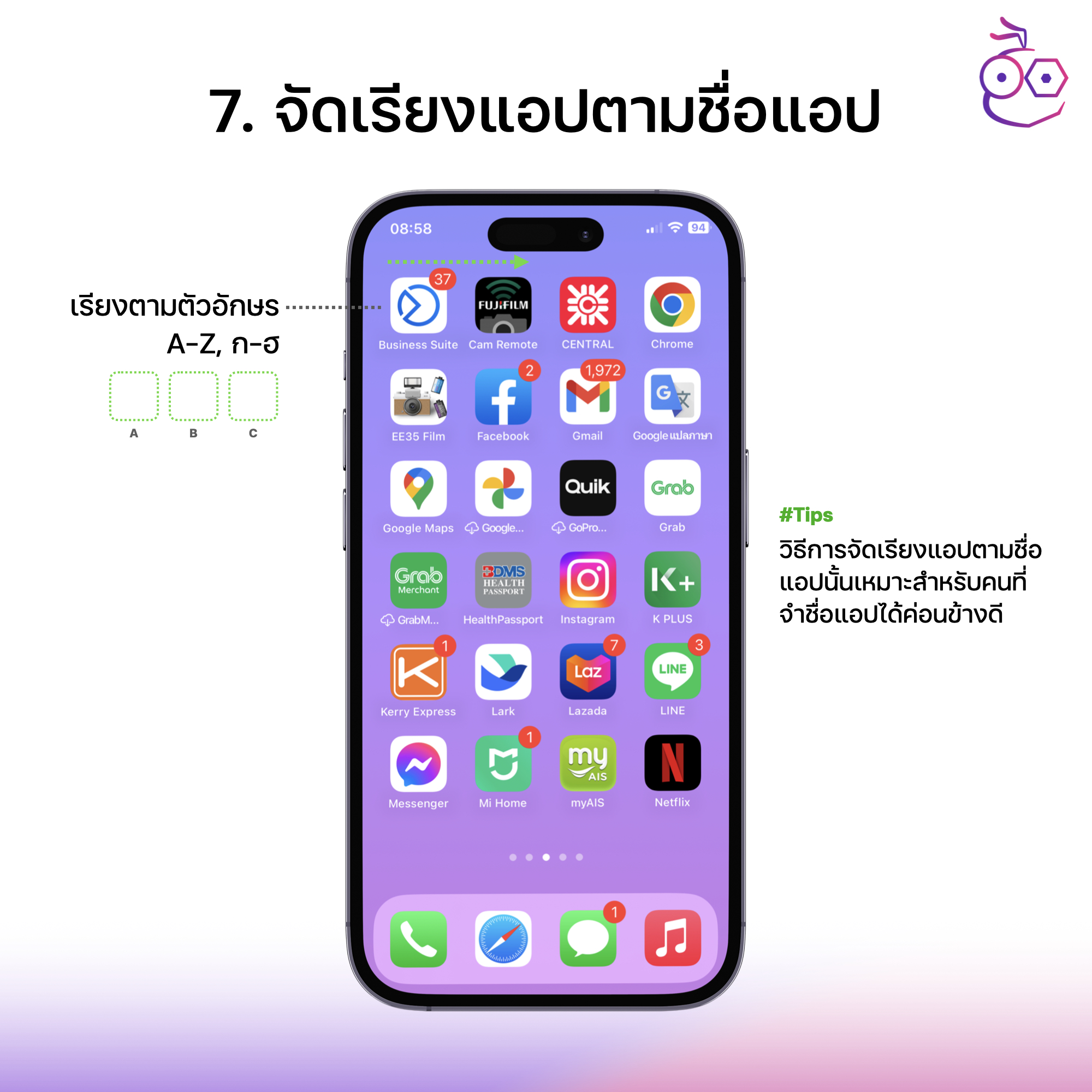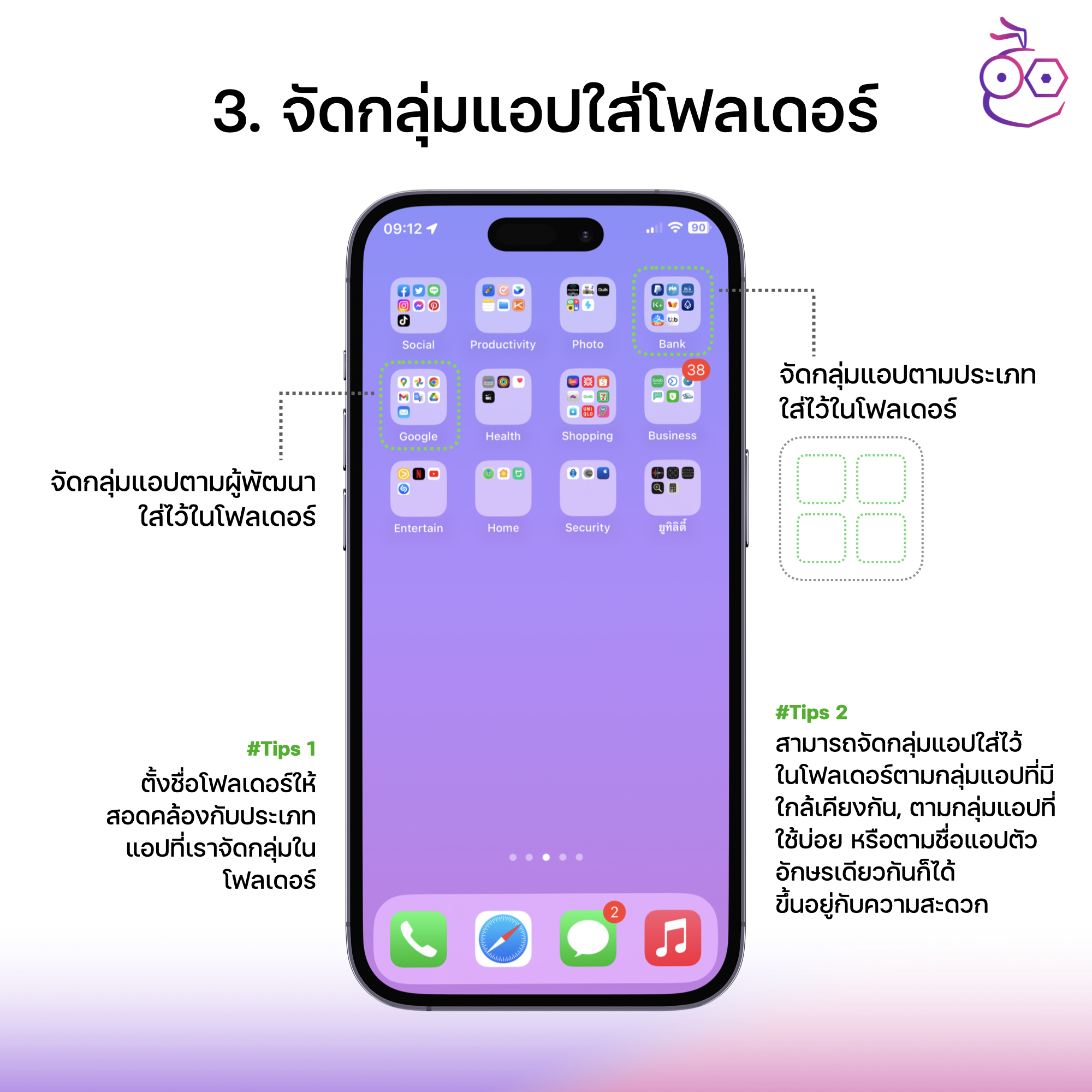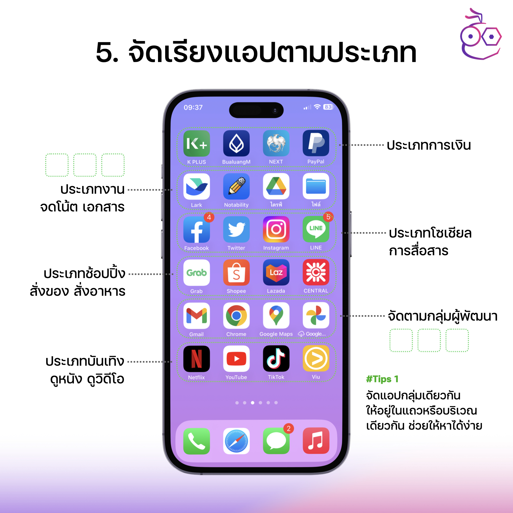 การจัดเรียงแอปตามประเภทแอปก็ช่วยให้เข้าถึงได้ง่ายขึ้น เช่น แอปการเงิน แอปการเรียน แอปโซเชียล เป็นต้น เราก็สามารถเรียงแอปประเภทเดียวกันมาไว้ด้วยกันได้เลย และอาจจะลำดับความสำคัญตามประเภทด้วยก็ได้