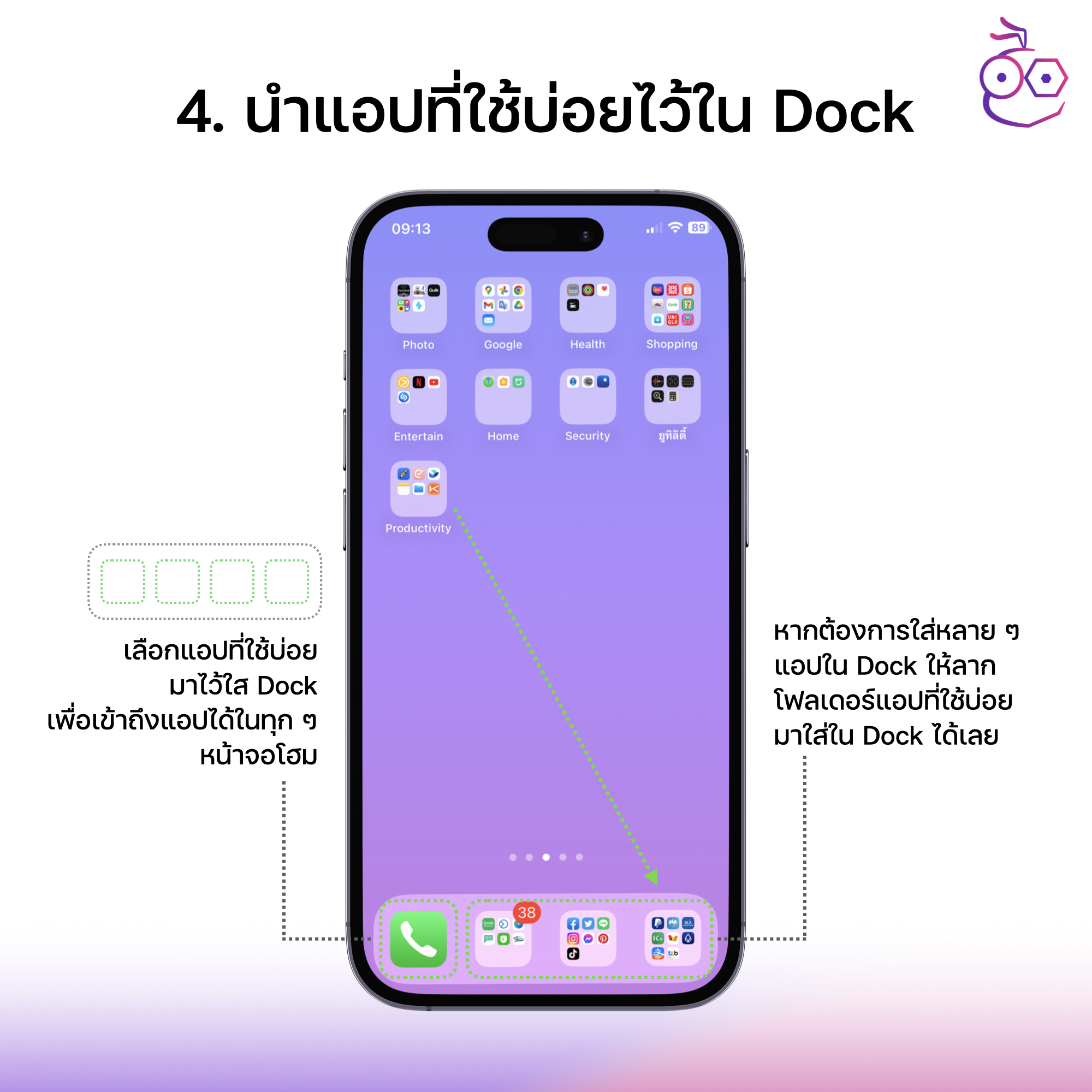 Dock ที่อยู่ด้านล่างหน้าโฮมนั้น เป็นตำแหน่งที่เหมาะสำหรับการวางแอปที่เราใช้งานบ่อยที่สุด เราสามารถปรับแต่งเพื่อจัดวางแอปที่เราต้องการได้ ปกติแล้วเราสามารถวางแอปได้ 4 แอปใน Dock