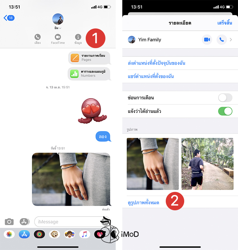 ซึ่งในน iOS 13.2 ก็ได้มีการนำกลับมา เมื่อมีการส่งรูปในข้อความเป็นจำนวนมากแล้วเราอยากจะลบออกบ้าง ก็สามารถลบได้ใน iMessage เพียงแค่ไปที่ห้องแชทข้อความ > แตะรูปโปรไฟล์ แล้วแตะข้อมูล (Info) > ดูรูปภาพทั้งหมด (See All Photos)