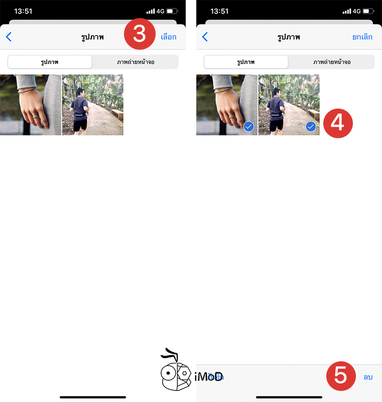 จากนั้นแตะเลือก (Select) แล้วเลือกรูปภาพที่ต้องการลบ > แตะ ลบ (Delete)