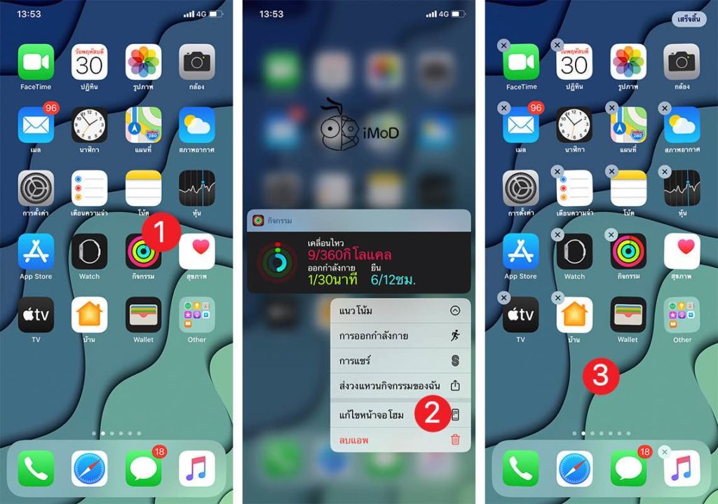 ใน iOS13.2 จึงปรับให้ง่ายขึ้นกว่าเดิม เพียงแค่แตะค้างที่ไอคอนแอป แล้วเลือกเมนู แก้ไขหน้าจอโฮม (Edit Home Screen ) จากนั้นก็ย้ายหรือลบแอปได้