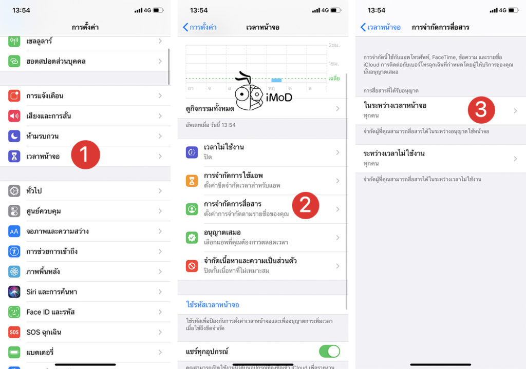 ตั้งค่าโดไปที่ การตั้งค่า (Settings) > เวลาหน้าจอ (Screen Time) > การจำกัดการสื่อสาร (Communication Limits) > กำหนดการจำกัดการสื่อสารได้เลย ทั้งในเวลาที่เปิดใช้เวลาหน้าจอและเวลาที่ไม่ได้เปิดใช้