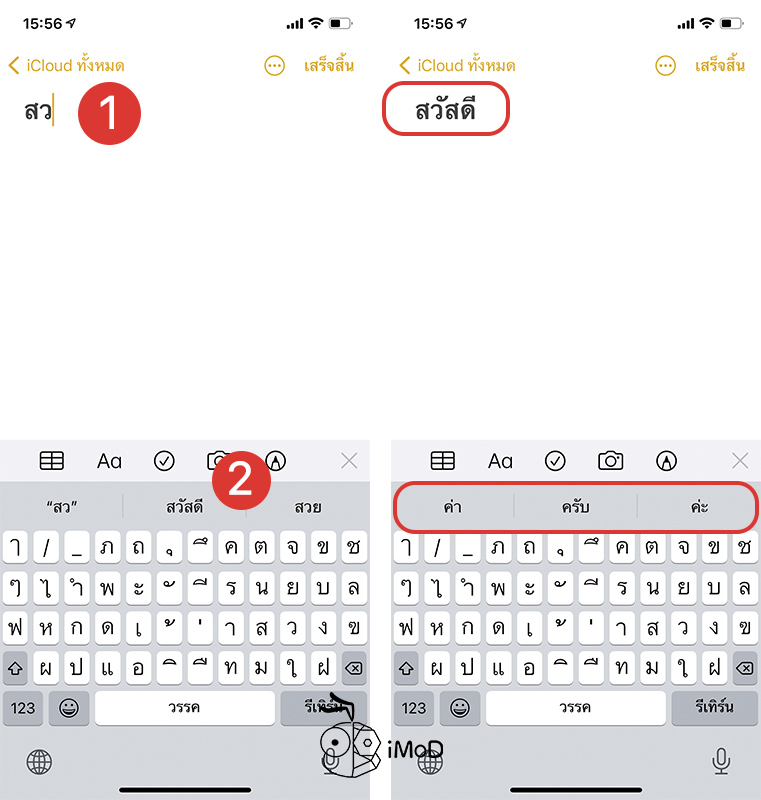 อย่างเช่น เรากำลังจะเริ่มพิมพ์คำยาว ๆ อย่าง สวัสดี เพียงพิมพ์ “สว” ด้านบนคีย์บอร์ดก็จะแนะนำคำที่ใกล้เคียงมาให้ เราสามารถแตะคำที่ต้องการได้เลย โดยไม่ต้องพิมพ์ต่อให้จบคำ แถมยังแนะนำคำที่น่าจะเหมาะสมกับคำที่เราพิมพ์ให้ด้วย ช่วยให้การพิมพ์รวดเร็วมากขึ้น