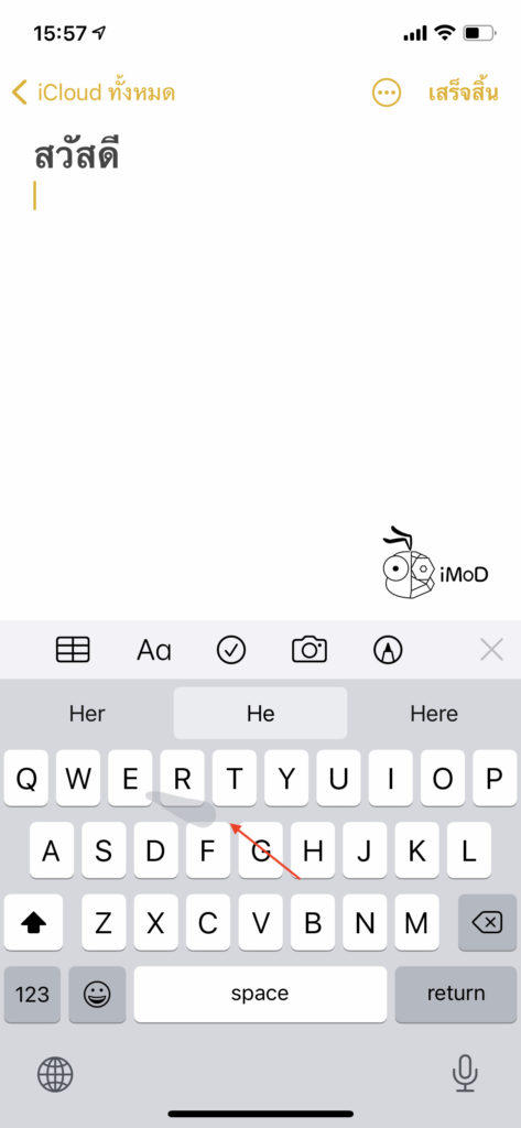 วิธีแรก จะใช้การแตะค้างที่ปุ่ม Space Bar แล้วก็เลื่อนเคอร์เซอร์ไปยังตำแหน่งที่ต้องการ จากนั้นก็พิมพ์คำได้เลย