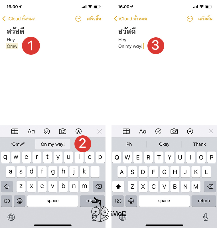 เวลาเรียกใช้งานเราก็พิมพ์คำย่อได้เลย ระบบก็จะแสดงเป็นคำหรือประโยคเต็มที่เราตั้งค่าไว้ สะดวกมาก ๆ