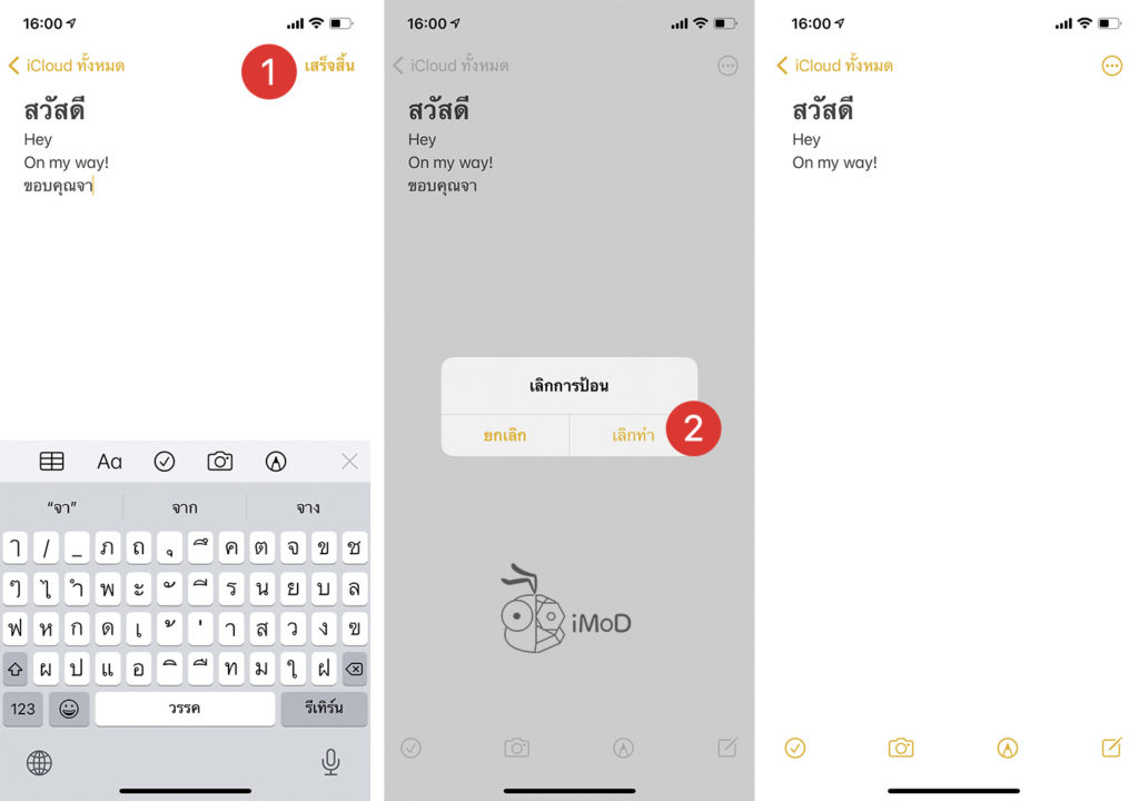 บน iPhone และ iPad มีฟีเจอร์เขย่าเพื่อเลิกทำ (Shake to Undo) เพื่อยกเลิกการกระทำก่อนหน้าได้อย่างรวดเร็ว ซึ่งการพิมพ์ข้อความก็สามารถทำได้เช่นกัน เวลาที่เราพิมพ์คำหรือข้อความผิด เราก็สามารถเขย่าเครื่อง แล้วแตะเลิกทำได้เลย โดยไม่ต้องแตะปุ่มลบหลาย ๆ ครั้ง