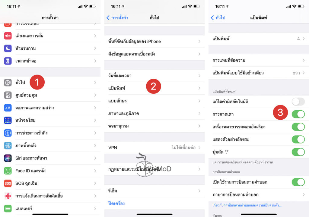 เข้าไปตั้งค่าได้ที่ การตั้งค่า (Settings) > ทั่วไป (General) > แป้นพิมพ์ (Keyboards) > เปิด การคาดเดา (Predictions)
