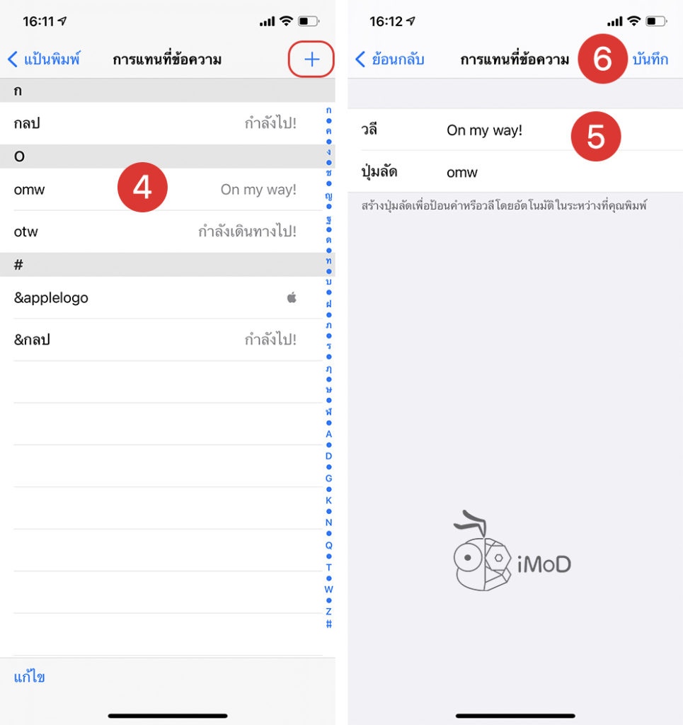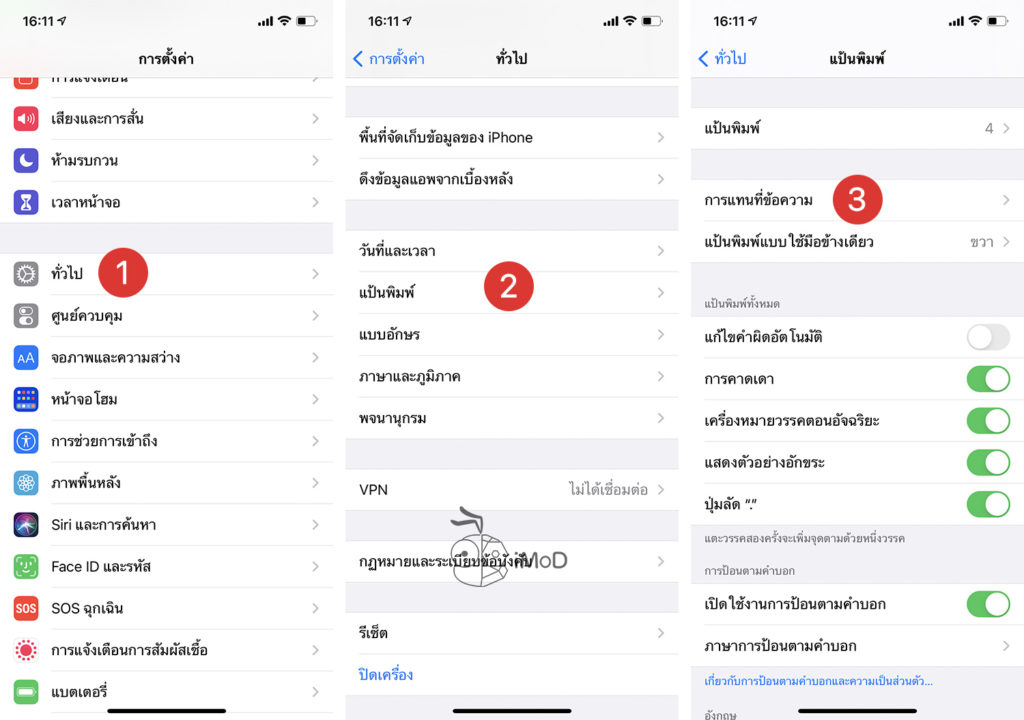 สามารถตั้งค่าได้ที่ การตั้งค่า (Settings) > ทั่วไป (General) > แป้นพิมพ์ (Keyboards) > การแทนที่ข้อความ (Text Replacement)