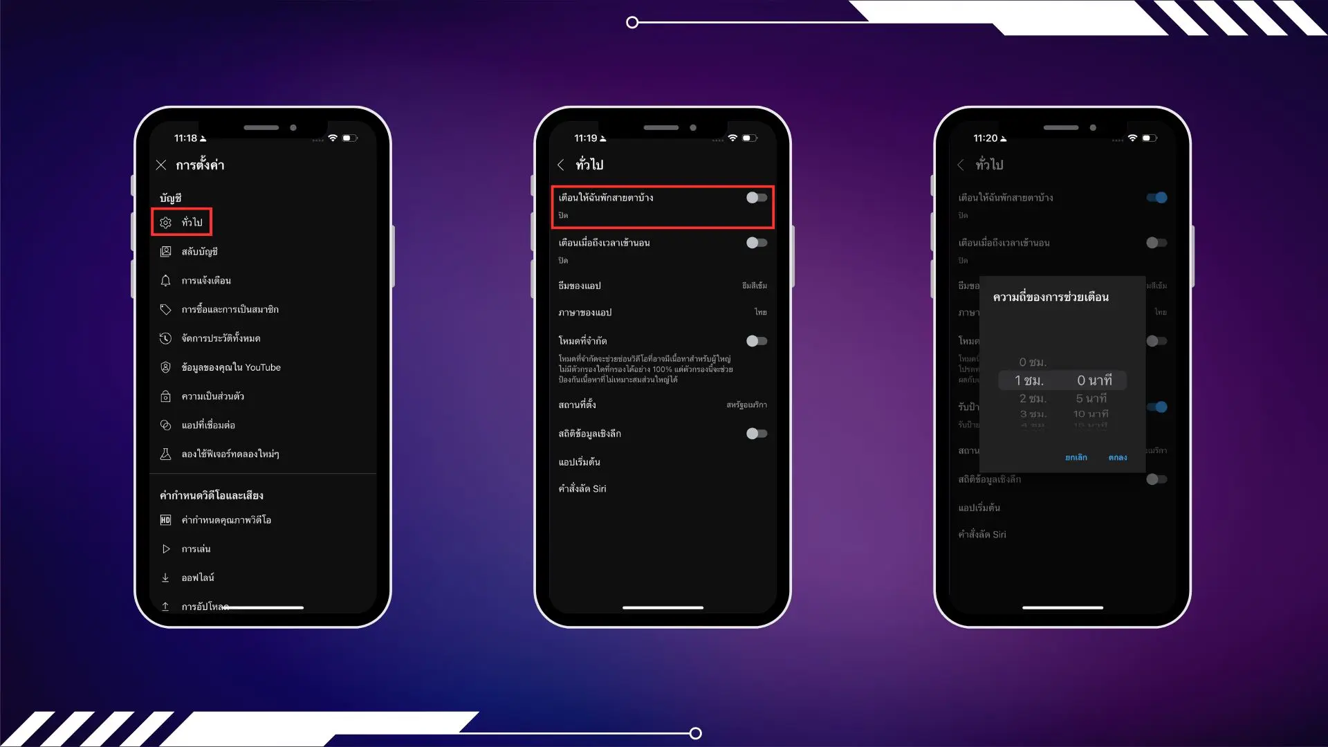 สามารถตั้งค่าหยุดชั่วคราวและหยุดพักหากคุณดูวิดีโอนานเกินไป ไปที่การตั้งค่าแอป > ทั่วไป แล้วเปิด เตือนให้ฉันพักสายตาบ้าง และ เลือกเวลาที่เหมาะสมกับคุณสำหรับการรับชม หรือตั้งให้เด็ก ๆ เพื่อกำหนดเวลาการใช้นอกจานี้คุณยังสามารถเลือกที่จะได้รับการเตือนว่าถึงเวลานอนแล้ว และคุณควรหยุดดูตอนนี้!