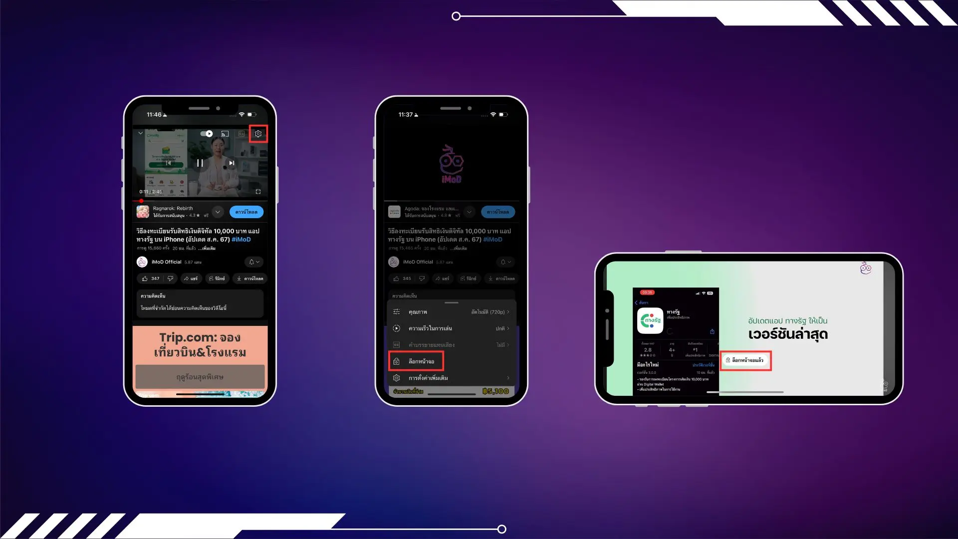 แตะไอคอนรูปเฟืองบนหน้าจอเล่นวิดีโอ YouTube แล้วเลือกหน้าจอล็อก วิดีโอจะหมุนเป็นมุมมองแนวนอนและบล็อกการสัมผัสหน้าจอ