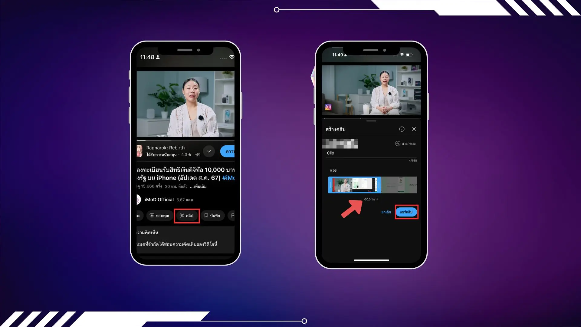 หากคุณอยากตัดบางส่วนเพื่อแชร์ในส่วนความรู้หรือสิ่งที่สำคัญก็สามารถทำได้ เพียงแค่กด คลิป จากนั้น กดตั้งชื่อคลิป และ เลือกระยะเวลา ที่เราอยากจะตัดเพื่อแชร์ออกไปตั้งแต่ 5วิ สูงสุด 60 วินาที (แต่ข้อควรระวังคือไม่ควรนำคลิปที่ตัดไปสร้างรายได้เพราะอาจจะโดนลิขสิทธิ์ได้)