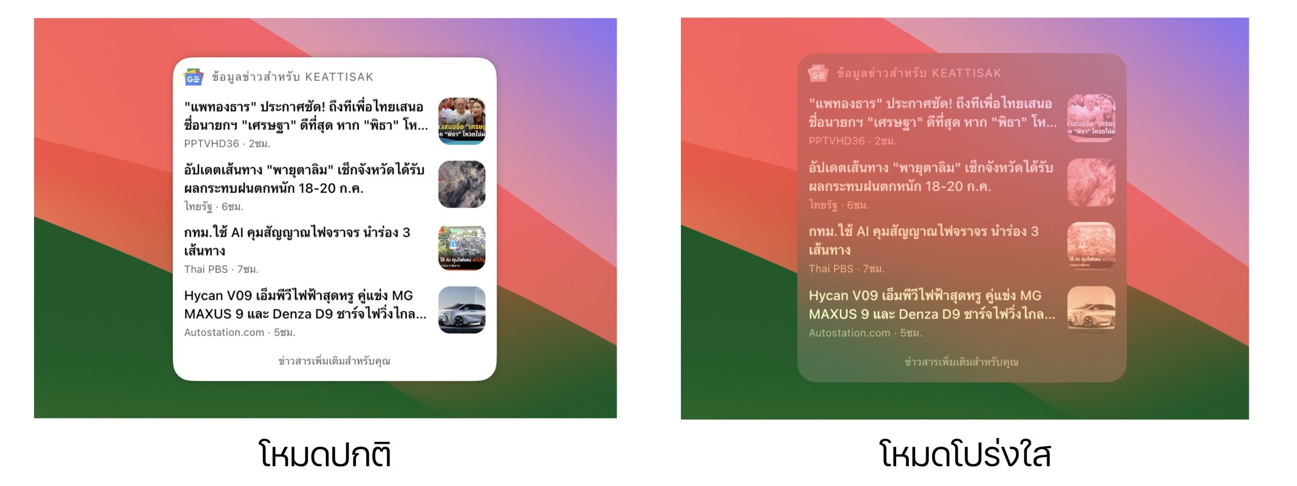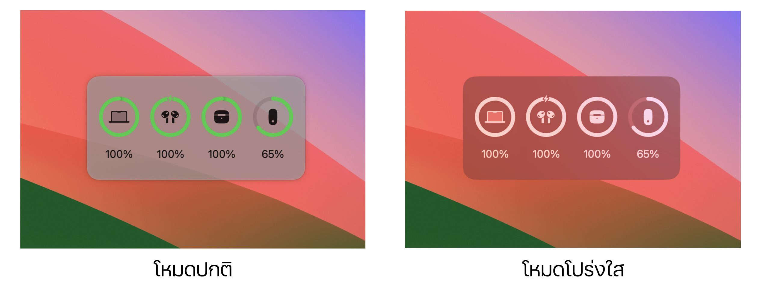 Widgets เดียวกันกับที่มีอยู่ใน iPhone ด้วยการใช้งานที่ดูเหมือนจะไม่มีอะไร แต่เป็นการแสดงข้อมูลที่ดีเอามาก ๆ เพราะเราใช้งานหน้าจอ Mac อยู่ตลอดเวลา ซึ่งเราสามารถสังเกตุ Battery ของอุปกรณ์ต่าง ๆ ได้เพียงแค่เหลือบมอง