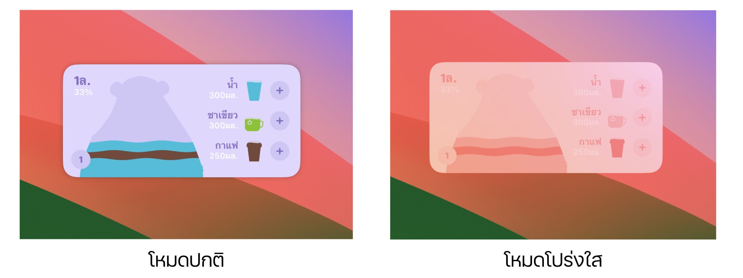 Widgets ที่ลิงก์มาจากแอปบนเครื่อง iPhone เหมาะสำหรับใครที่อยากตั้งเป้าหมายการดื่มน้ำในแต่ละวันให้ถึงตามเป้าที่ตั้งเอาไว้ การมี Widgets ตัวนี้อยู่บนหน้าจอเครื่อง Mac ของเราก็จะช่วยเตือนเกี่ยวกับการดื่มน้ำของเราได้ดีมากยิ่งขึ้น