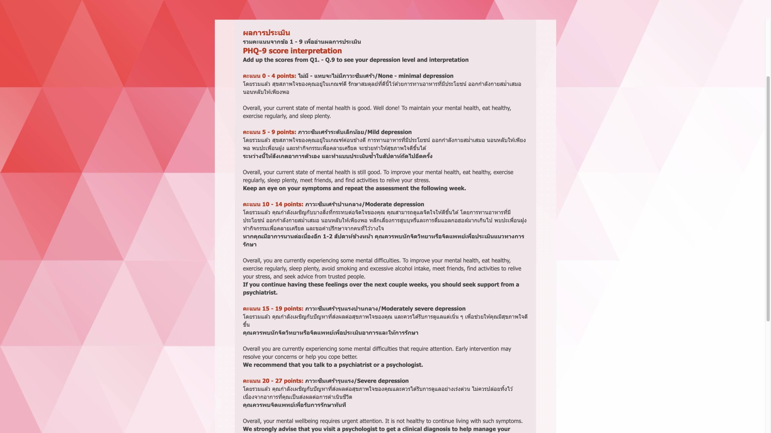 ตัวเว็บก็จะบอกว่าเรามีโอกาสเป็นซึมเศร้ามั้ย และควรไปพบแพทย์เพื่อบำบัดหรือไม่