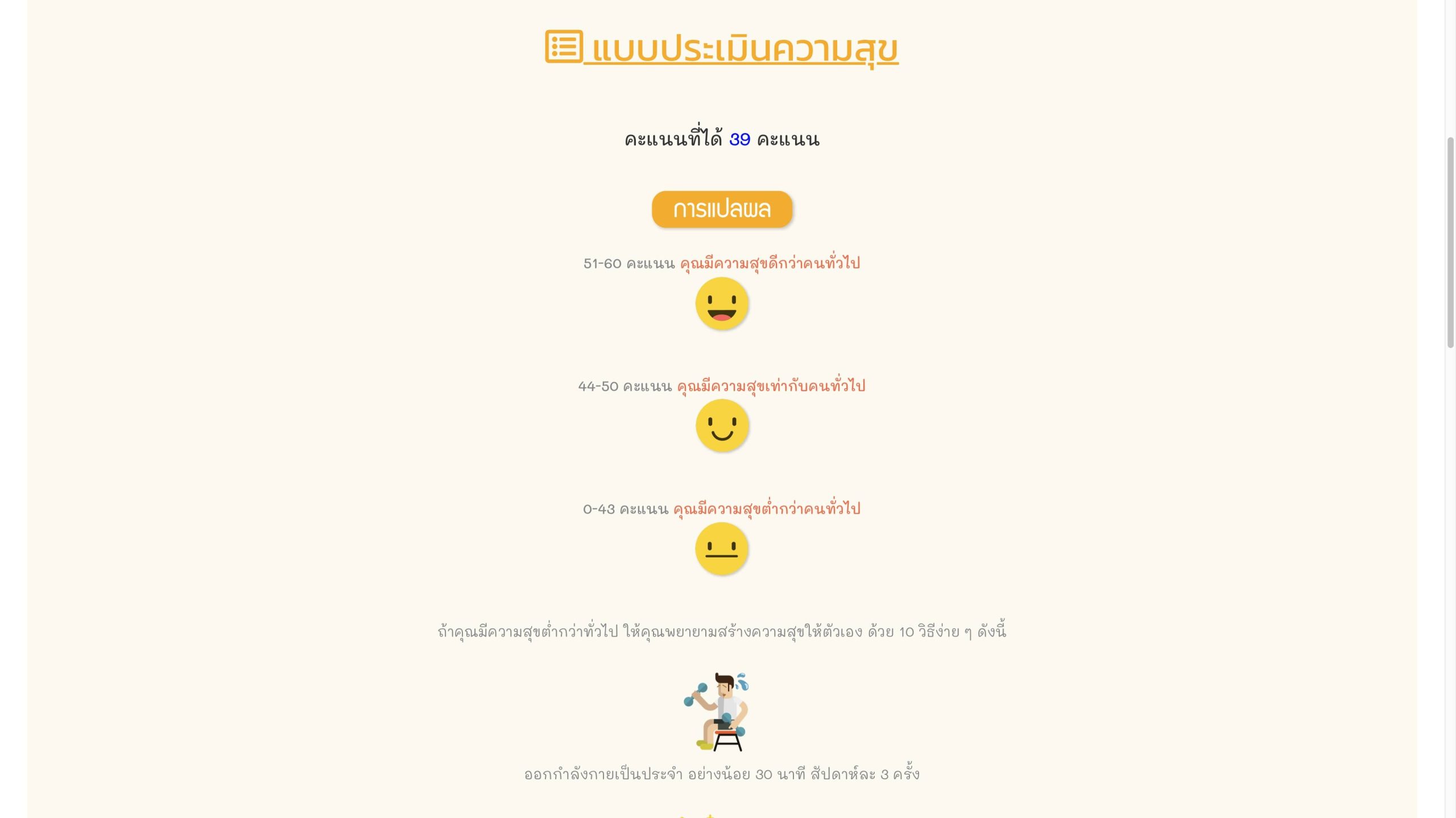 ผลลัพธที่ประเมินผลออกมาตัวเว็บก็จะบอกคะแนนว่าเราได้คะแนนเท่าไหร่ แล้วนำผลที่ได้มาแปลผลได้เลย