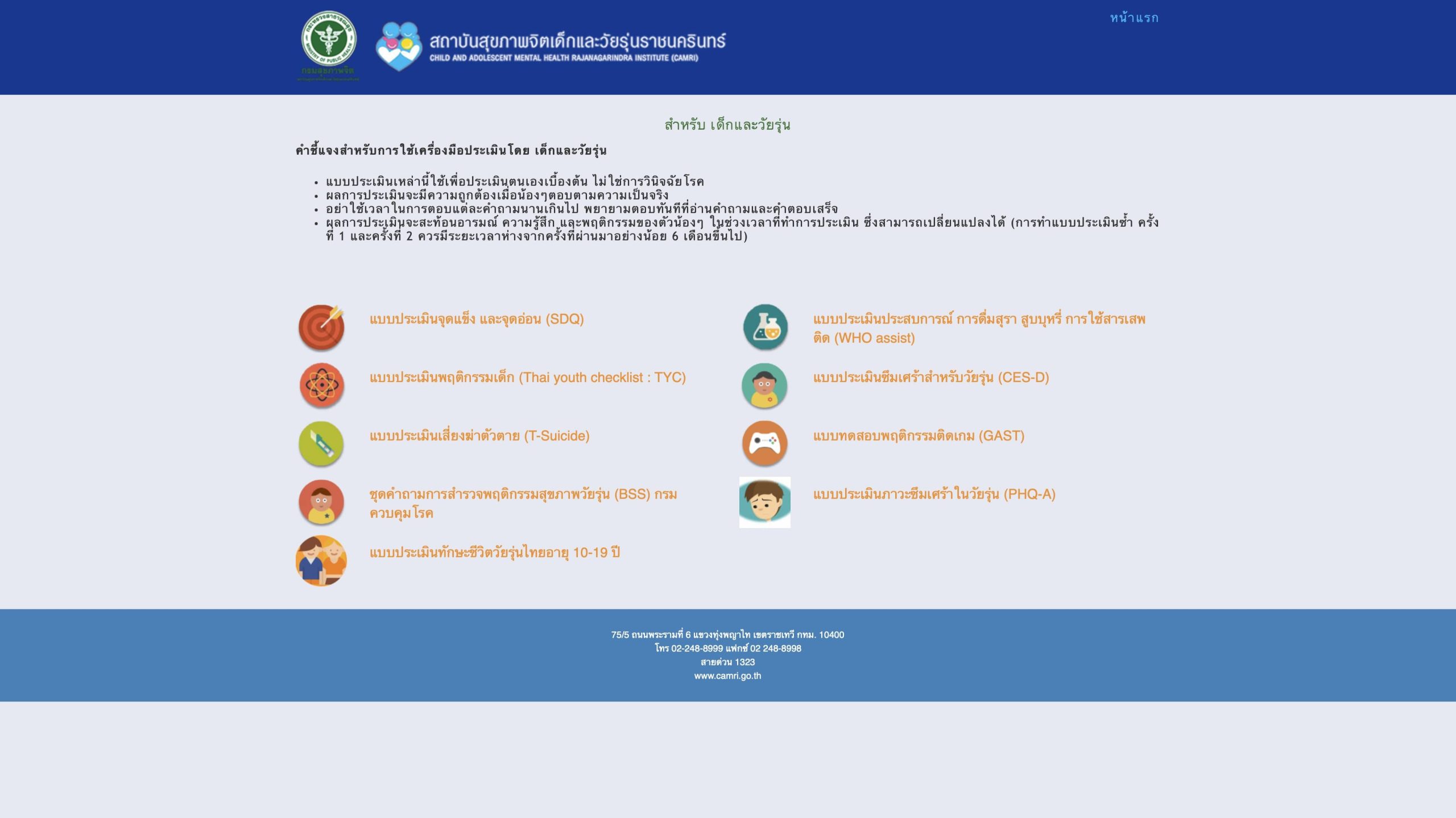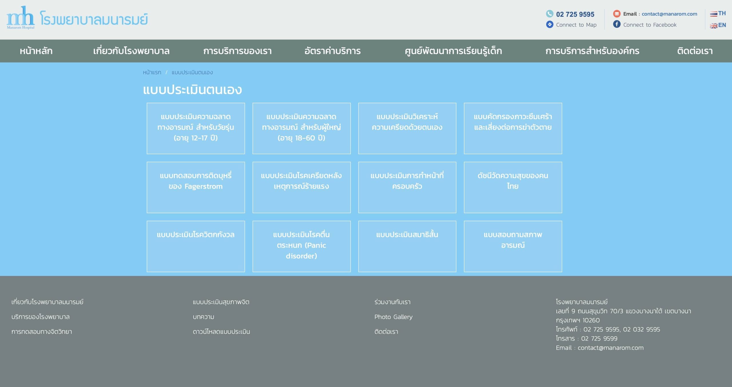 เว็บนี้จะมีแบบทดสอบให้เลือกทำหลายอันมาก ๆ ไม่ว่าจะเป็น แบบคัดกรองภาวะซึมเศร้าและเสี่ยงต่อการฆ่าตัวตาย แบบสอบถามสภาพอารมณ์ และอื่น ๆ
