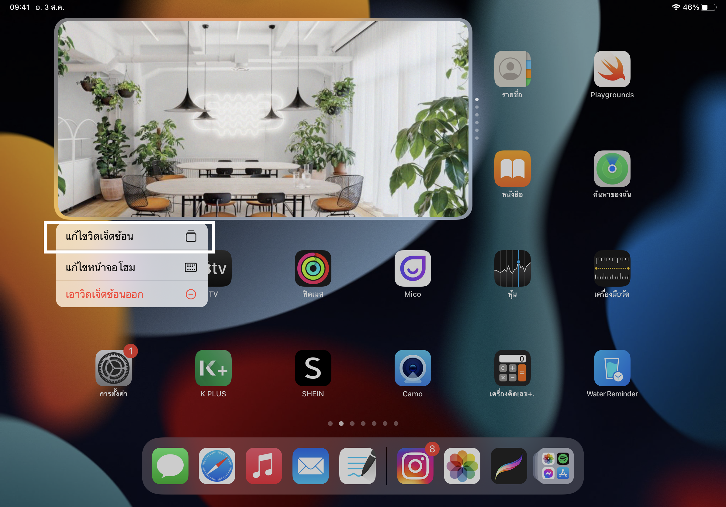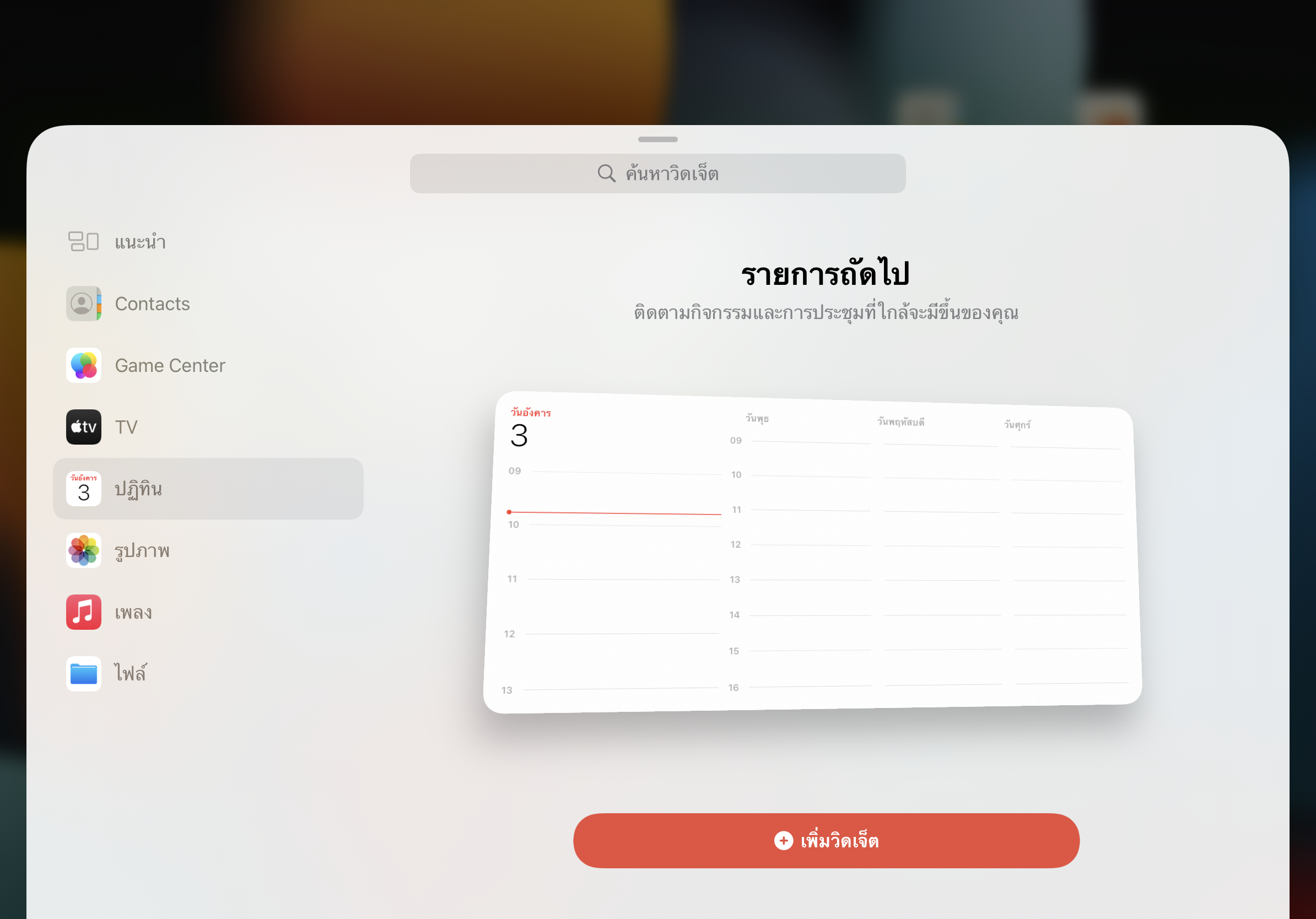 - การเพิ่มวิดเจ็ตย่อย : กดบวก > เลือกวิดเจ็ต > เพิ่มวิดเจ็ต