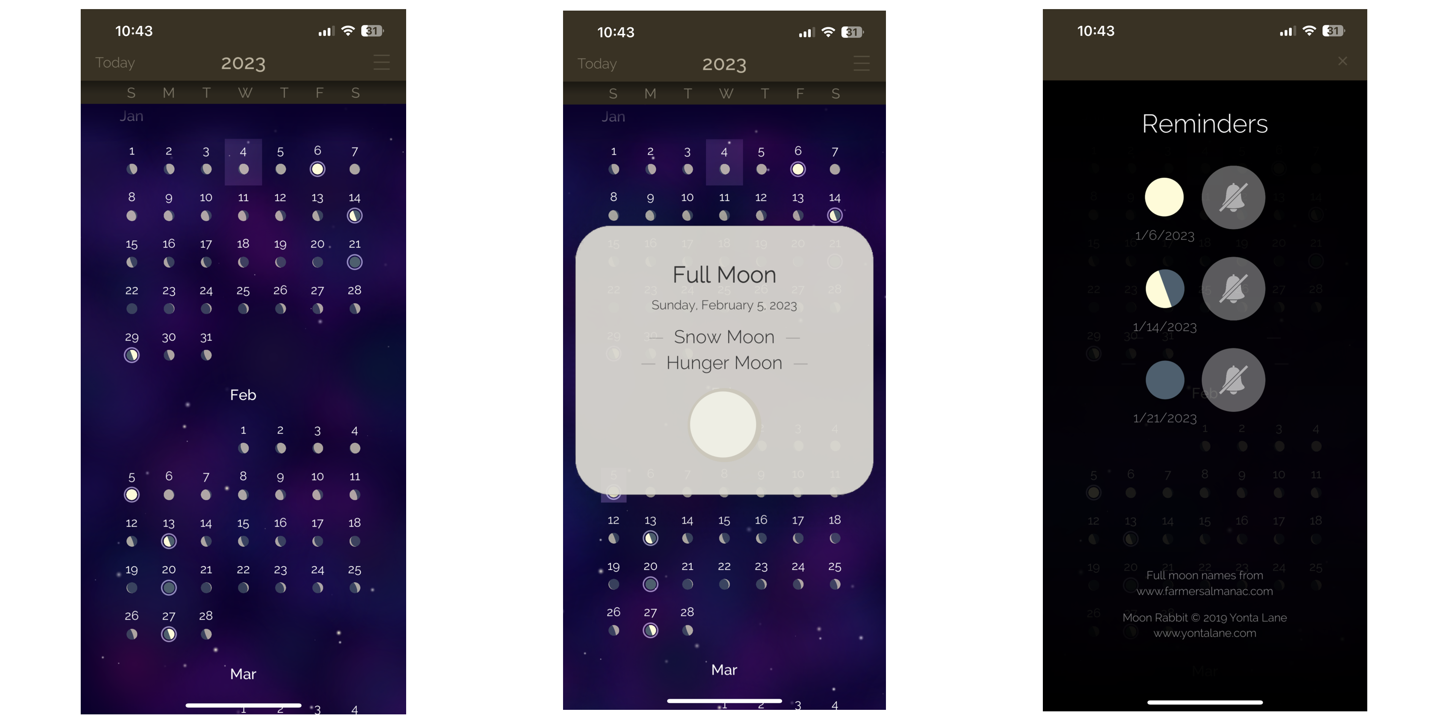 สายดูดาวต้องชื่นชอบแอปนี้อย่างแน่นอน เพราะ Moon Rabbit จะเป็นผู้ช่วยในการบอกเราว่า ในวันนั้น ๆ ของปี พระจันทร์จะเป็นอย่างไร เต็มดวง, ข้างขึ้น, ข้างแรม หรือในวันนั้นๆ พระจันทร์ที่เราเห็นเรียกว่าอย่างไร อีกทั้งสามารถแจ้งเตือนตามที่เราต้องการเลือกได้อีกด้วย