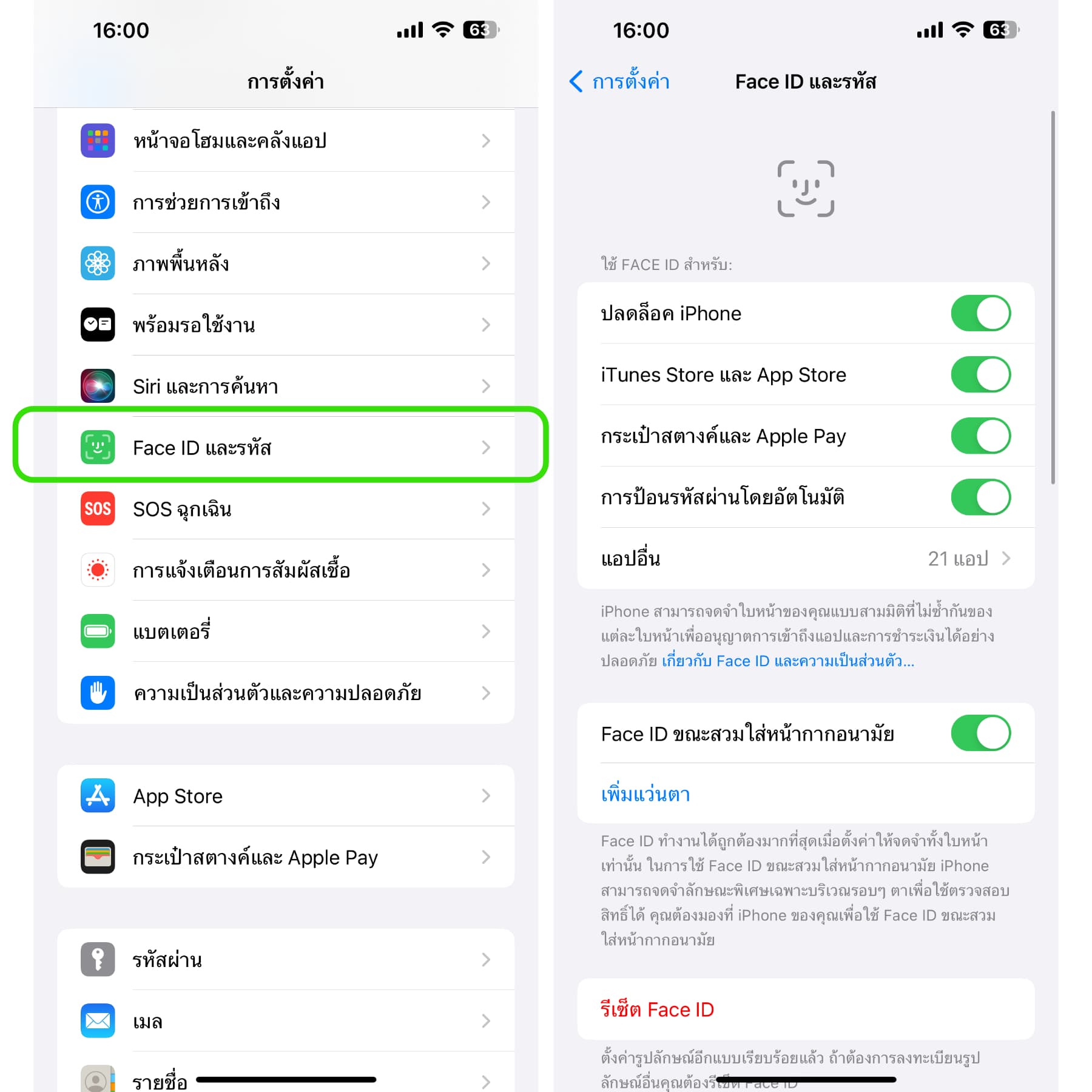 เข้าไปตั้งค่าได้ที่แอปการตั้งค่า > Face ID และรหัส