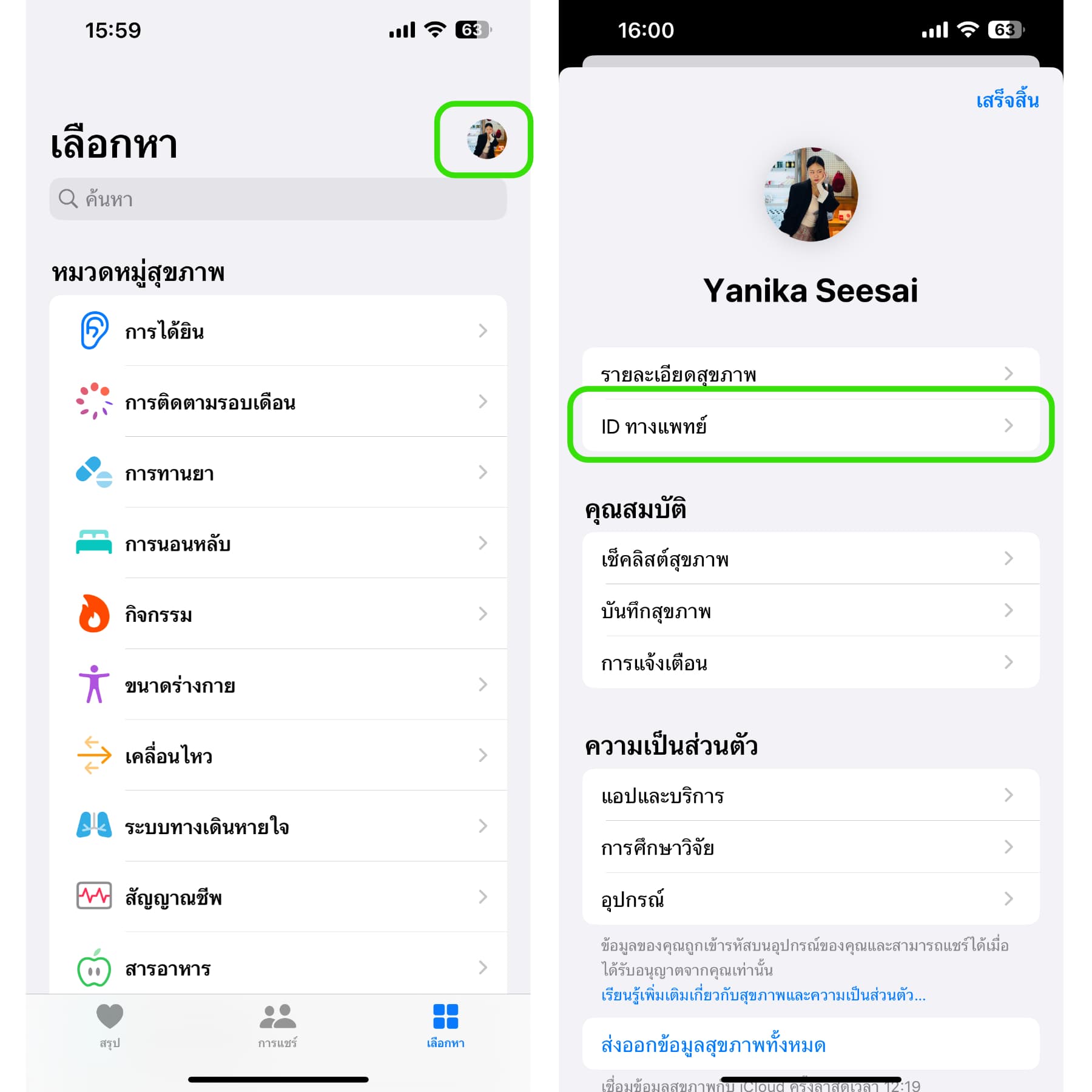 สามารถเข้าไปตั้งค่า ID ทางแพทย์ได้โดยไปที่ แอปสุขภาพ > แตะที่รูปขอเราตรงมุมบนขวา > ID ทางแพทย์
