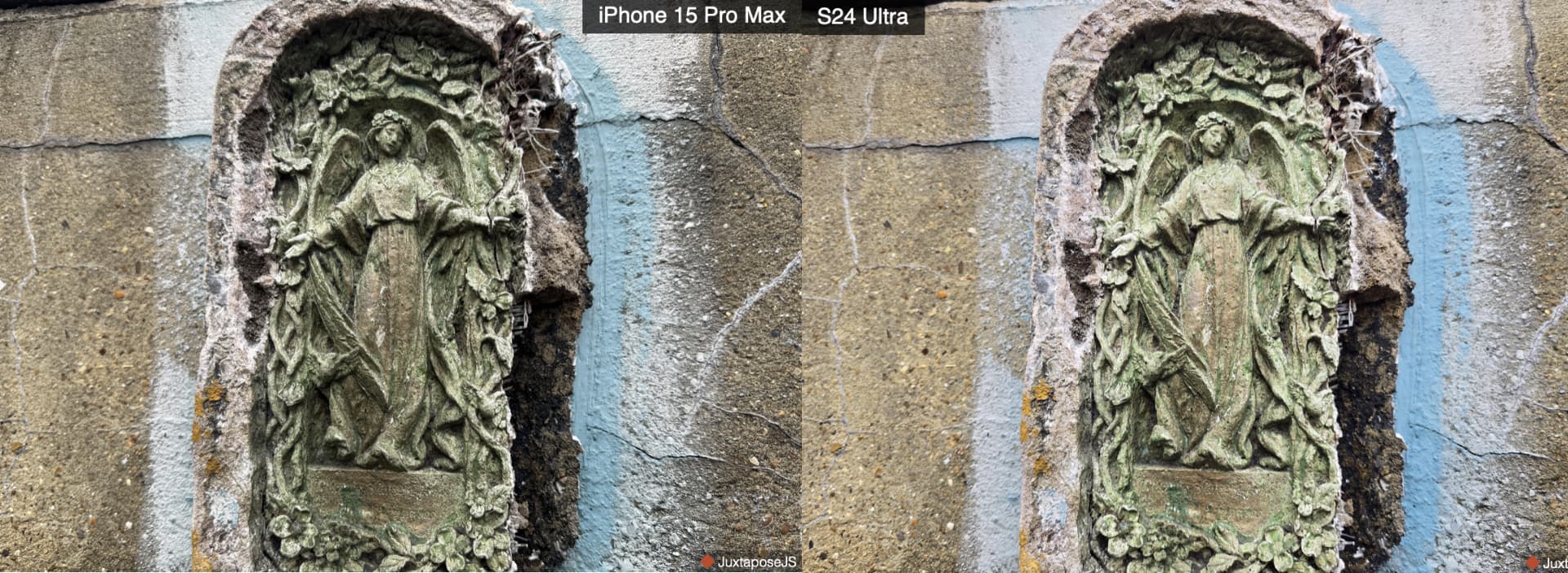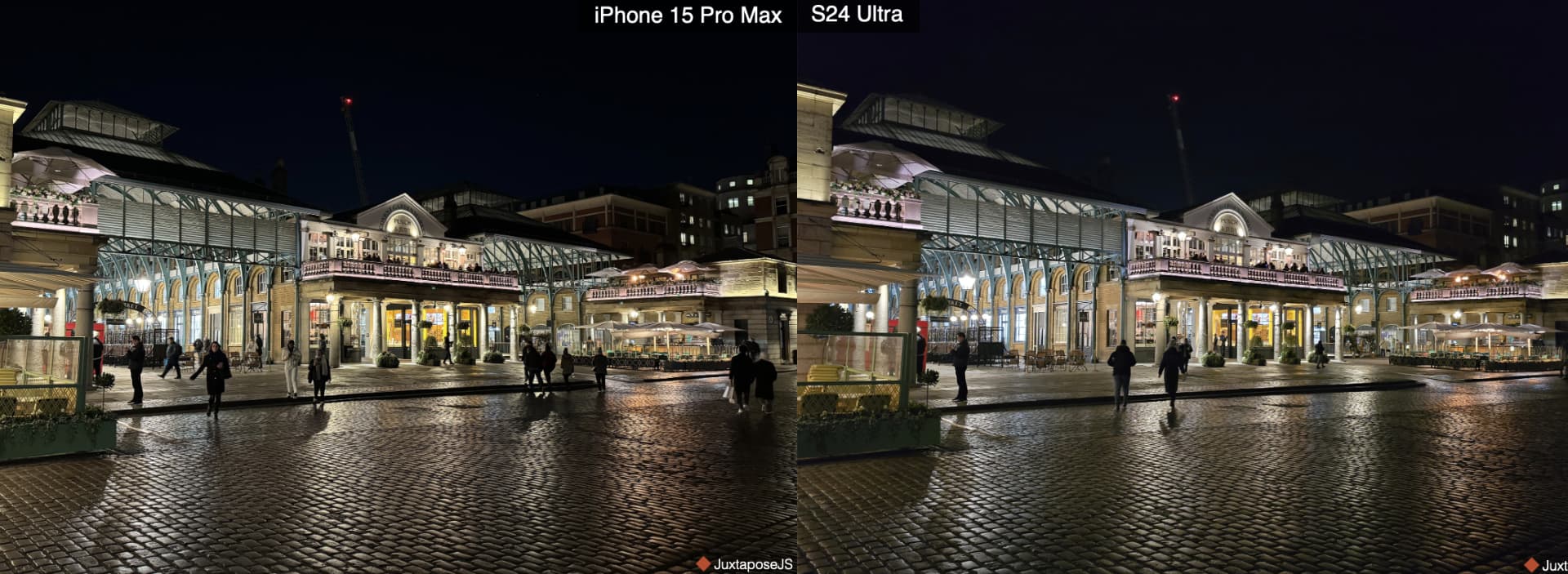 ภายใต้สภาพแสงน้อย จะเห็นได้ว่า iPhone 15 Pro Max ให้ภาพถ่ายที่ดูสว่างกว่า เก็บสีได้มากกว่า ถ้าลองดูรายละเอียดเล็ก ๆ น้อย ๆ จะเห็นว่ามีการเปิดรับแสงมากกว่า เงาก็ทำออกมาได้ดี ส่งผลให้ภาพถ่ายโดยรวมดูดีกว่ารูปที่ได้จาก Galaxy S24 Ultra