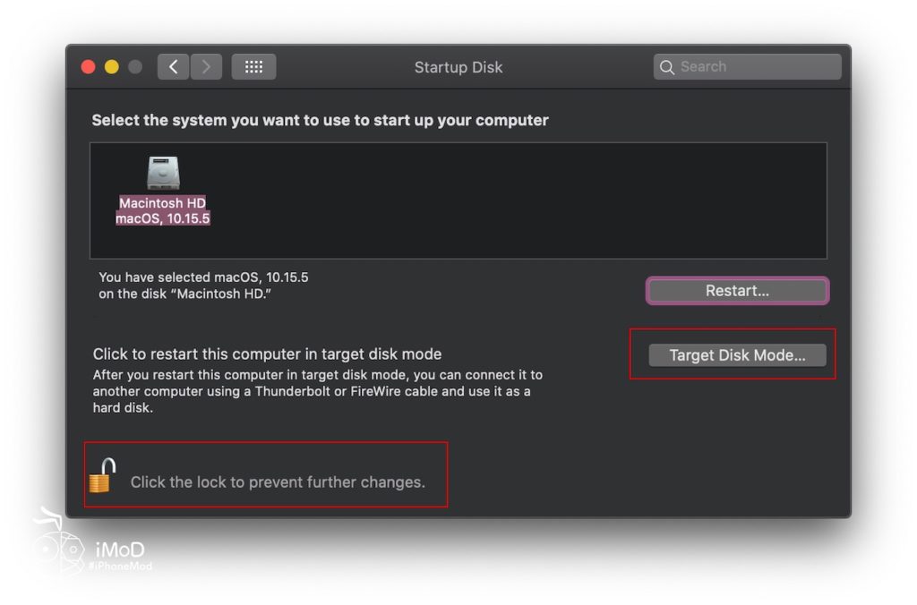 จากนั้นก็เปิด System Preference > Startup Disk > ปลดล็อค และคลิก Target Disk Mode > คลิก Restart เพื่อเข้าสู่ Target Disk Mode (หรือจะรีสตาร์ตเครื่องแล้วเข้า Target Disk Mode ตอนรีบูทเครื่องด้วยการกดปุ่ม T ค้างไว้ก็ได้)