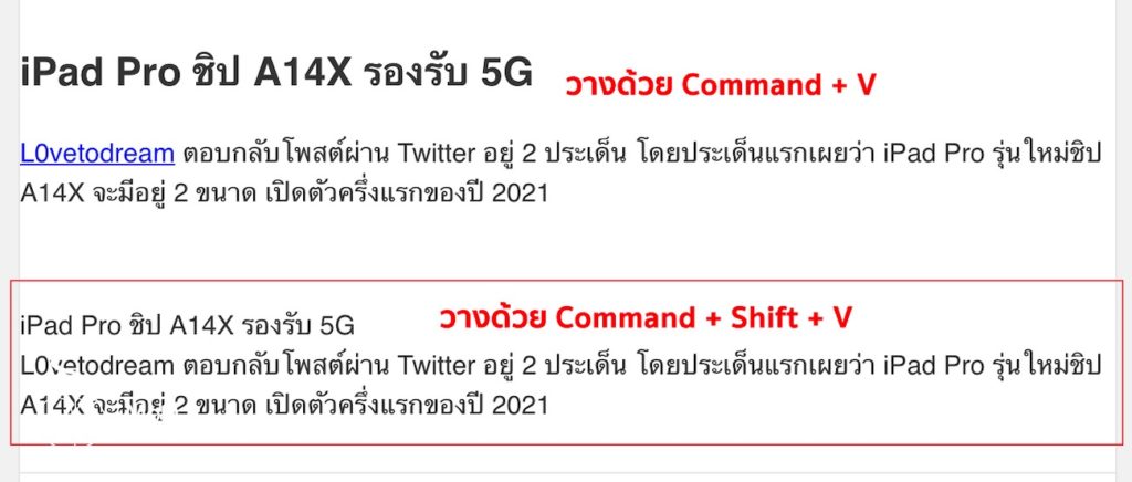 แต่ถ้าหากเราต้องการวางแบบไม่มี Format เน้นวางเฉพาะ Text อย่างเดียว เราสามารถวางแบบ Paste and Match Style หรือใช้คีย์ลัดบนคีย์บอร์ด Command + Shift + V ได้ เพื่อวางเป็นข้อความปกติแบบไร้ Format ตามมา