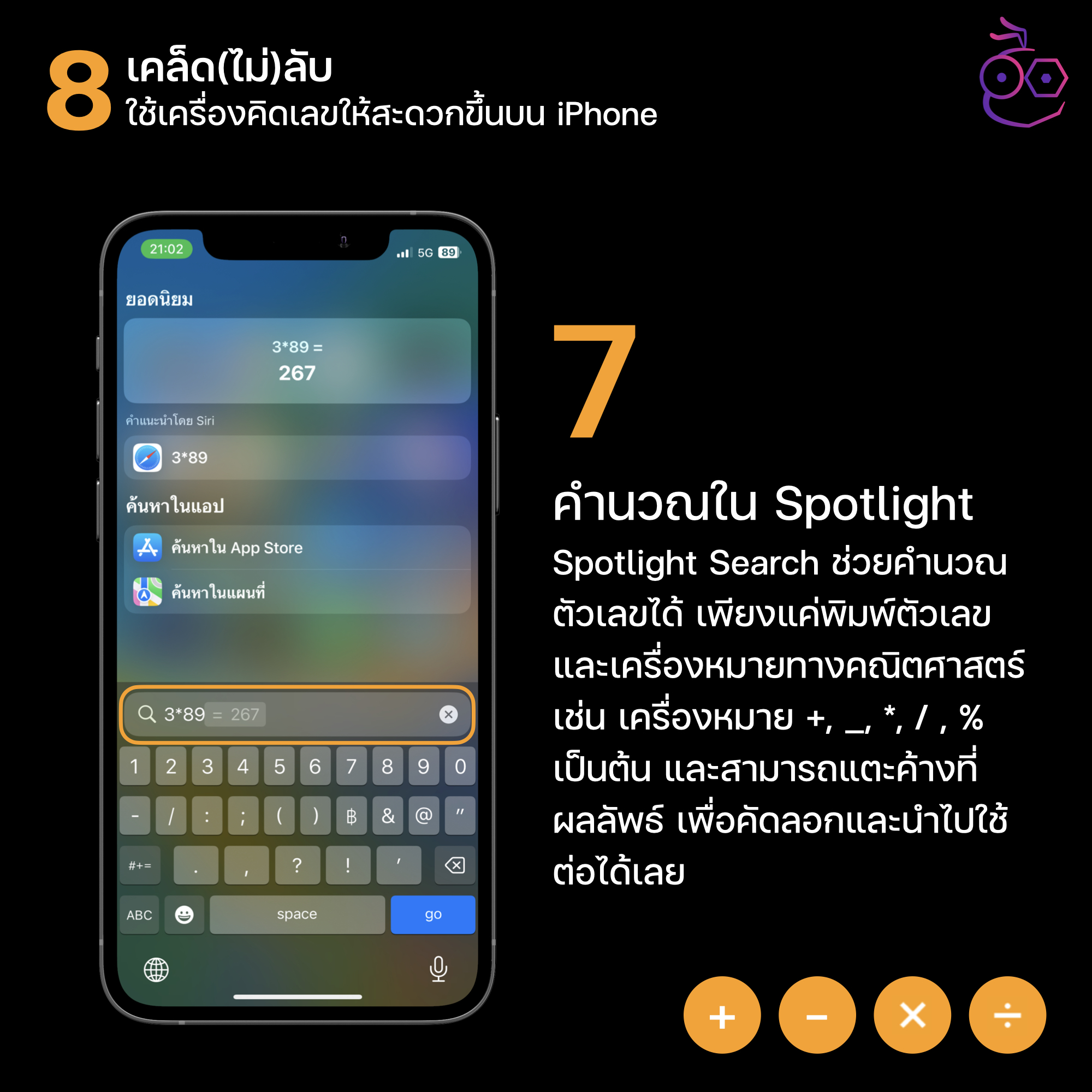 นอกจากเราจะใช้ Siri ช่วยคำนวณแบบรวดเร็วแล้ว เรายังสามารถใช้ส่วนของ Spotlight Search ช่วยคำนวณตัวเลขได้ด้วย เพียงแค่พิมพ์ตัวเลขและเครื่องหมายทางคณิตศาสตร์ เช่น เครื่องหมาย +, _, *, / , % เป็นต้น และสามารถแตะค้างที่ผลลัพธ์ เพื่อคัดลอกและนำไปใช้ต่อได้เลย