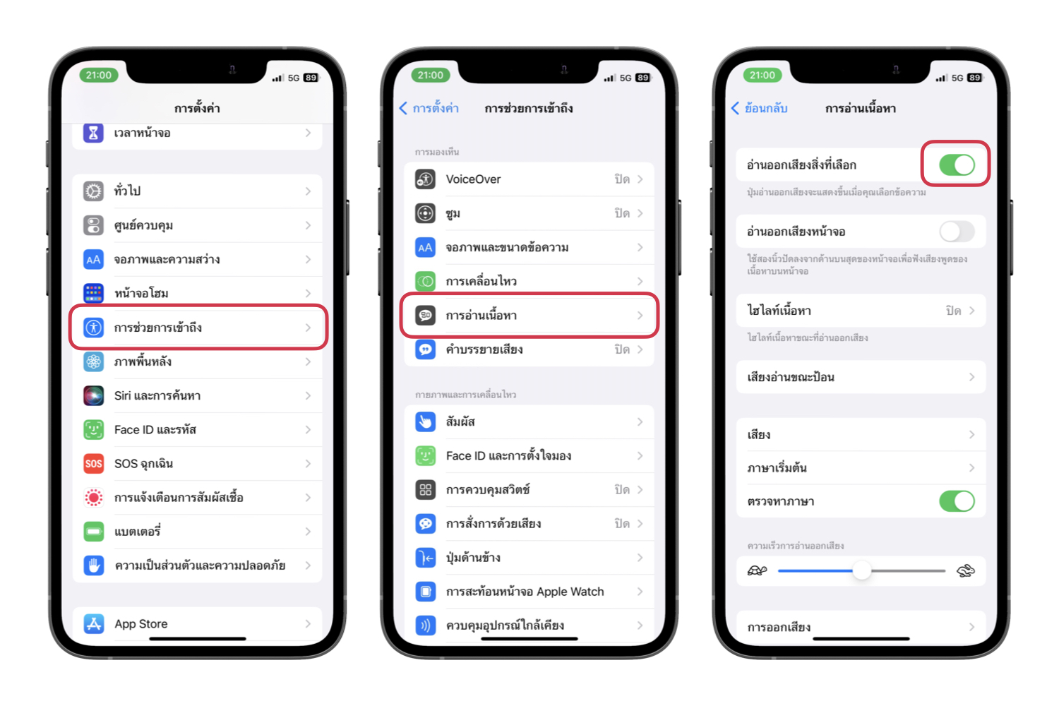 ไปที่ การตั้งค่า (Settings) > การช่วยการเข้าถึง (Accessibility) > แตะ การอ่านเนื้อหา (Spoken Content) > แตะเปิด การอ่านออกเสียงสิ่งที่เลือก (Speak Selection)