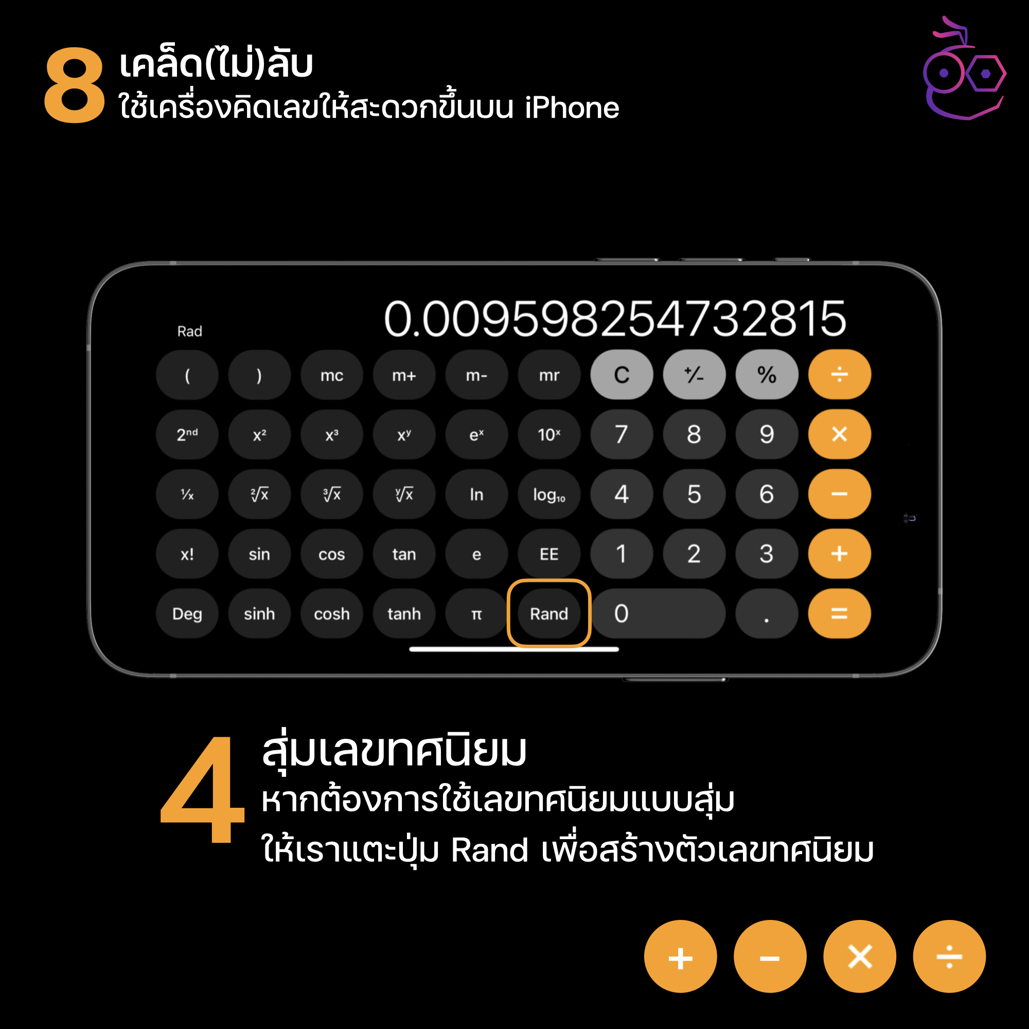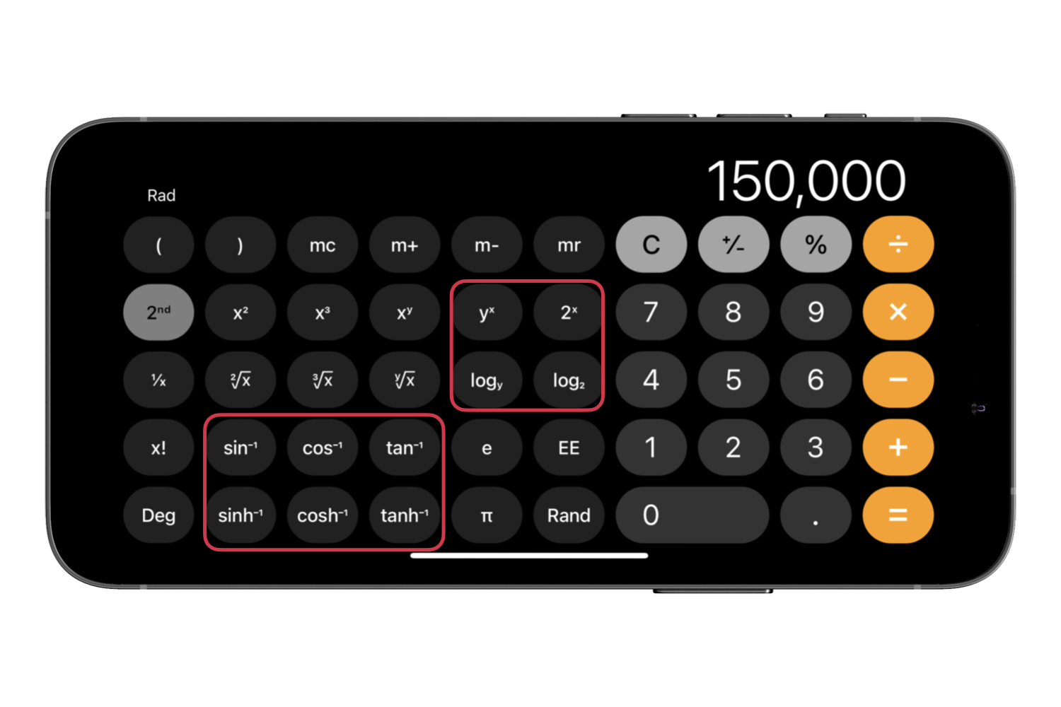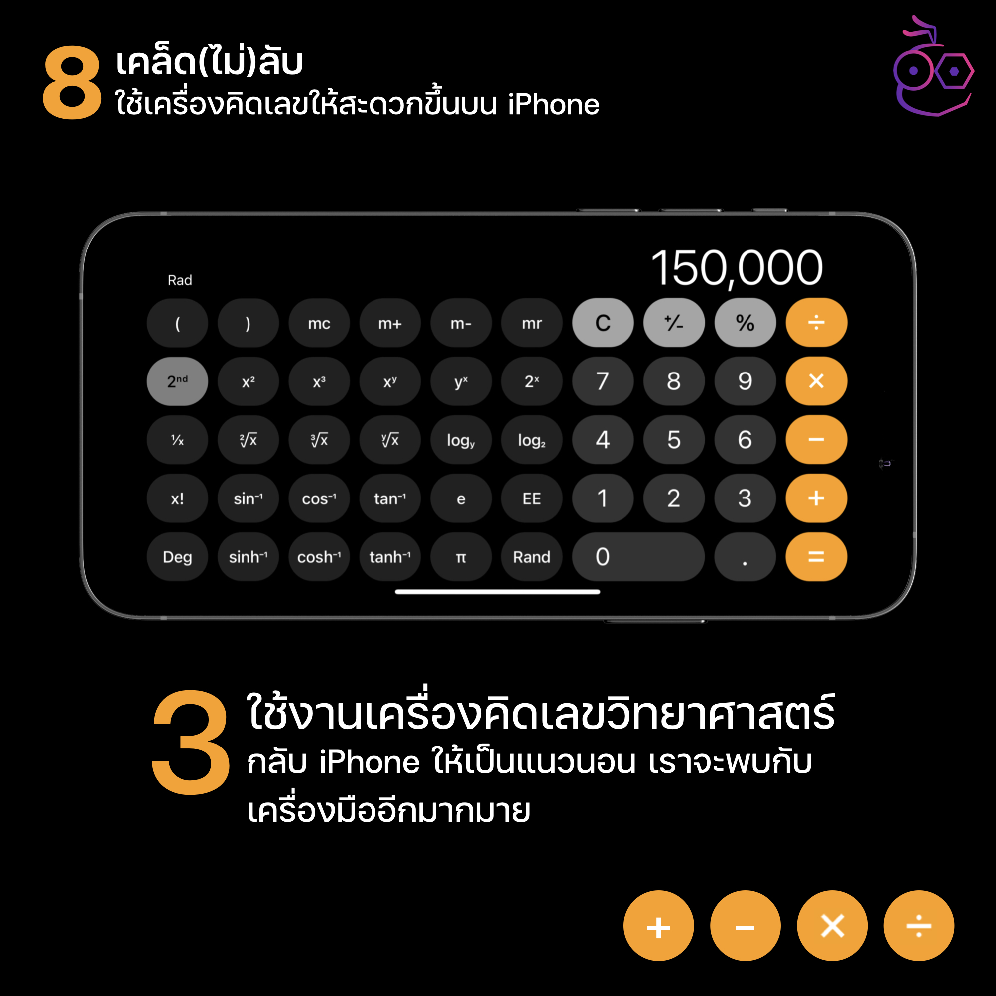 สำหรับการคำนวณที่ซับซ้อนมากขึ้น เช่น sin, cos, tan หรือเลขยกกำลัง เราสามารถใช้เครื่องคิดเลขวิทยาศาสตร์ได้ เพียงแค่กลับ iPhone ให้เป็นแนวนอน ตัวเลือกการคำนวณเพิ่มเติมก็จะแสดงขึ้นมา