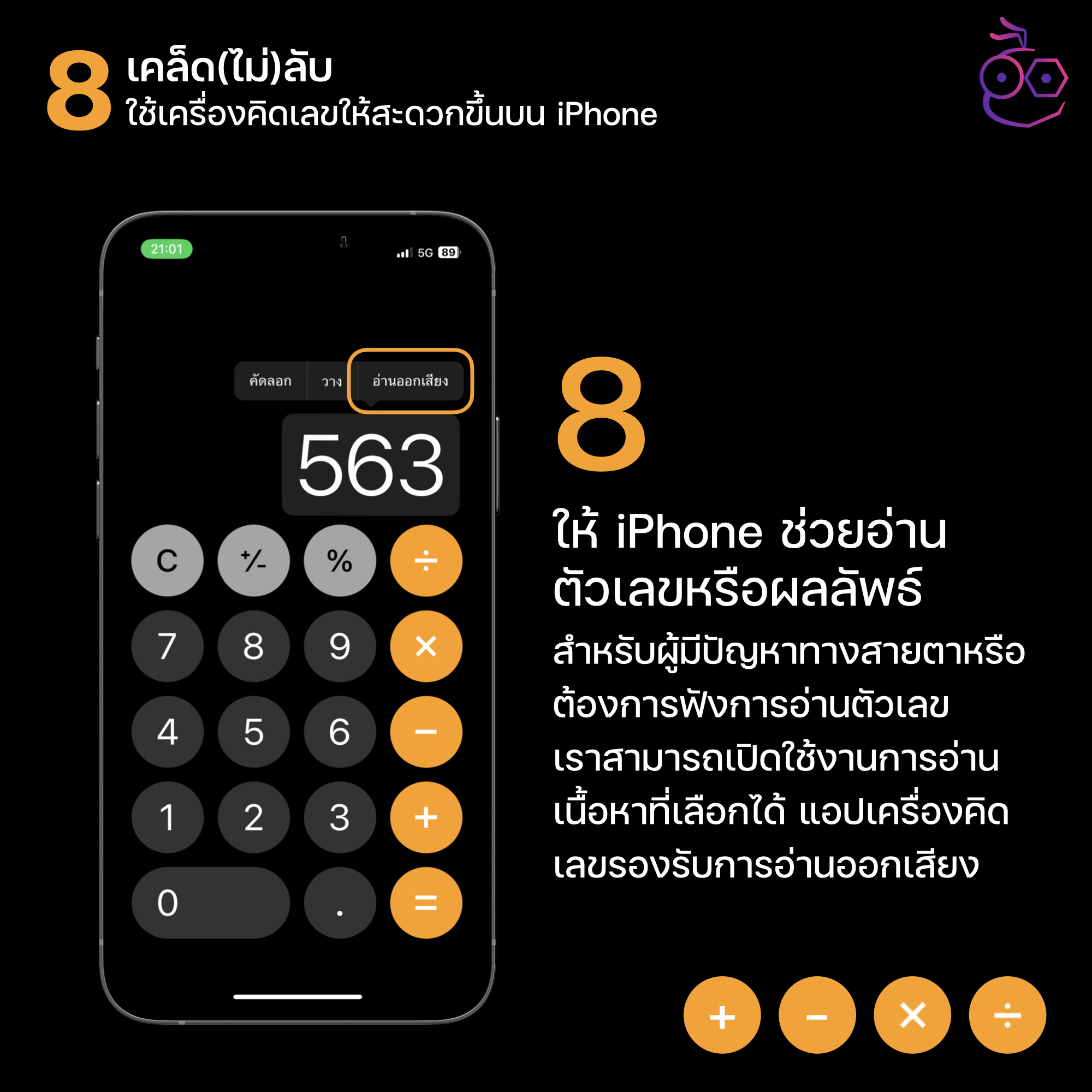 เมื่อใช้งานในเครื่องคิดเลข ให้เราแตะค้างที่ผลลัพธ์ แล้วแตะ อ่านออกเสียง iPhone ก็จะอ่านตัวเลขให้เราฟัง