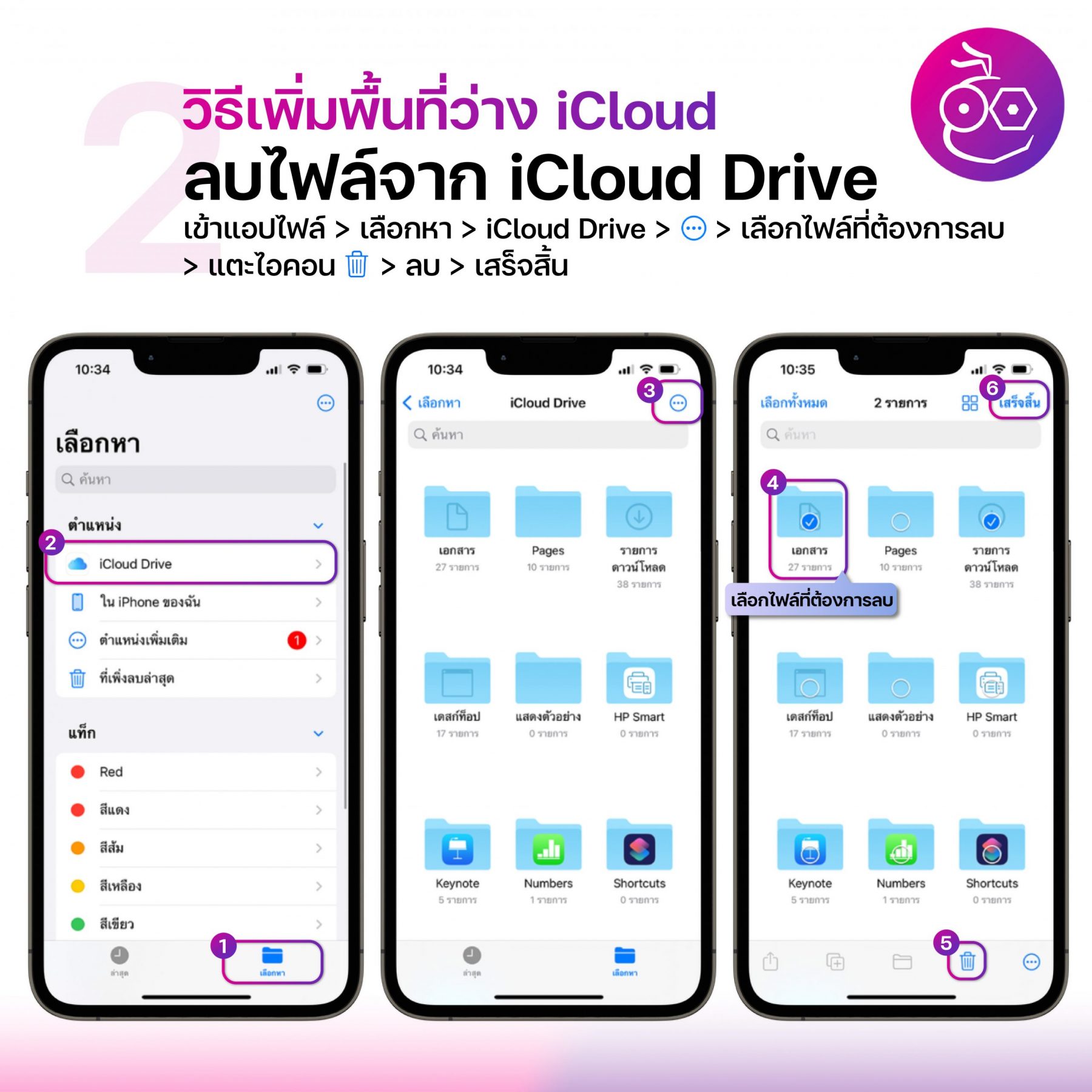 เข้าไปที่แอปไฟล์ (File) > เลือกหา > iCloud Drive > แตะที่จุดสามจุด > เลือกไฟล์ที่ต้องการลบ > แตะไอคอนรูปถังขยะ > ลบ > เสร็จสิ้น