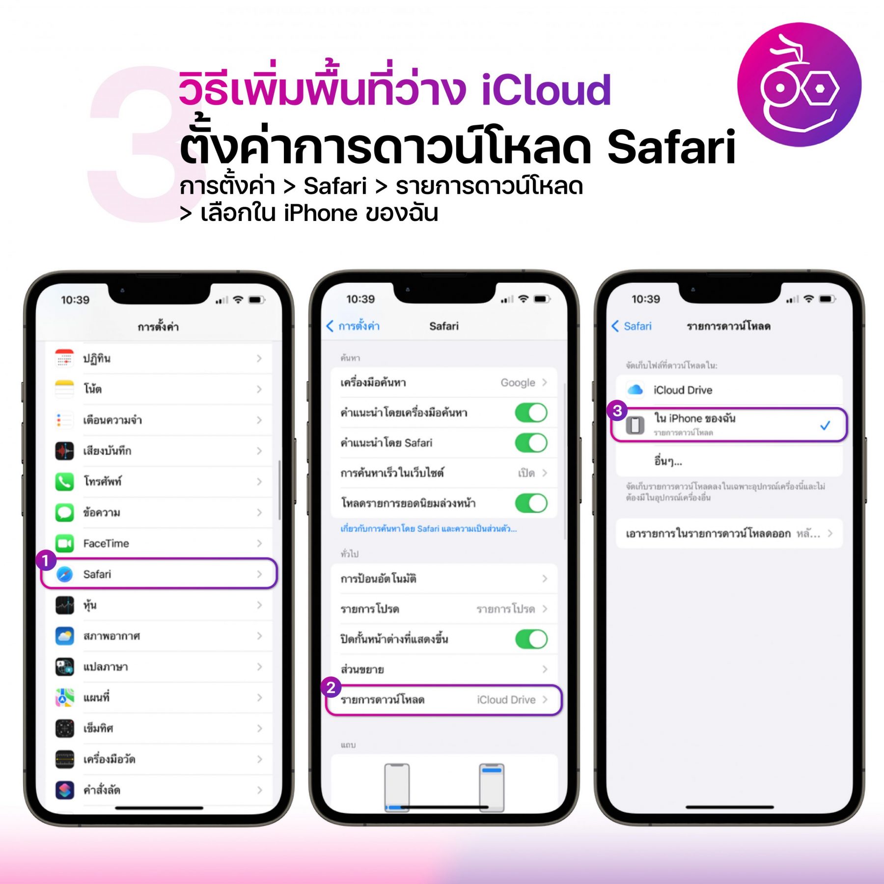 แนะนำให้ตั้งค่าการดาวน์โหลด Safari โดยเลือกดาวน์โหลดลงใน iPhone บางคนอาจจะไปเผลอตั้งค่าการดาวน์โหลดไฟล์ที่ดาวน์โหลดผ่าน Safari ไว้บน iCloud Drive จึงทำให้พื้นที่ iCloud เต็มเร็วนั่นเอง