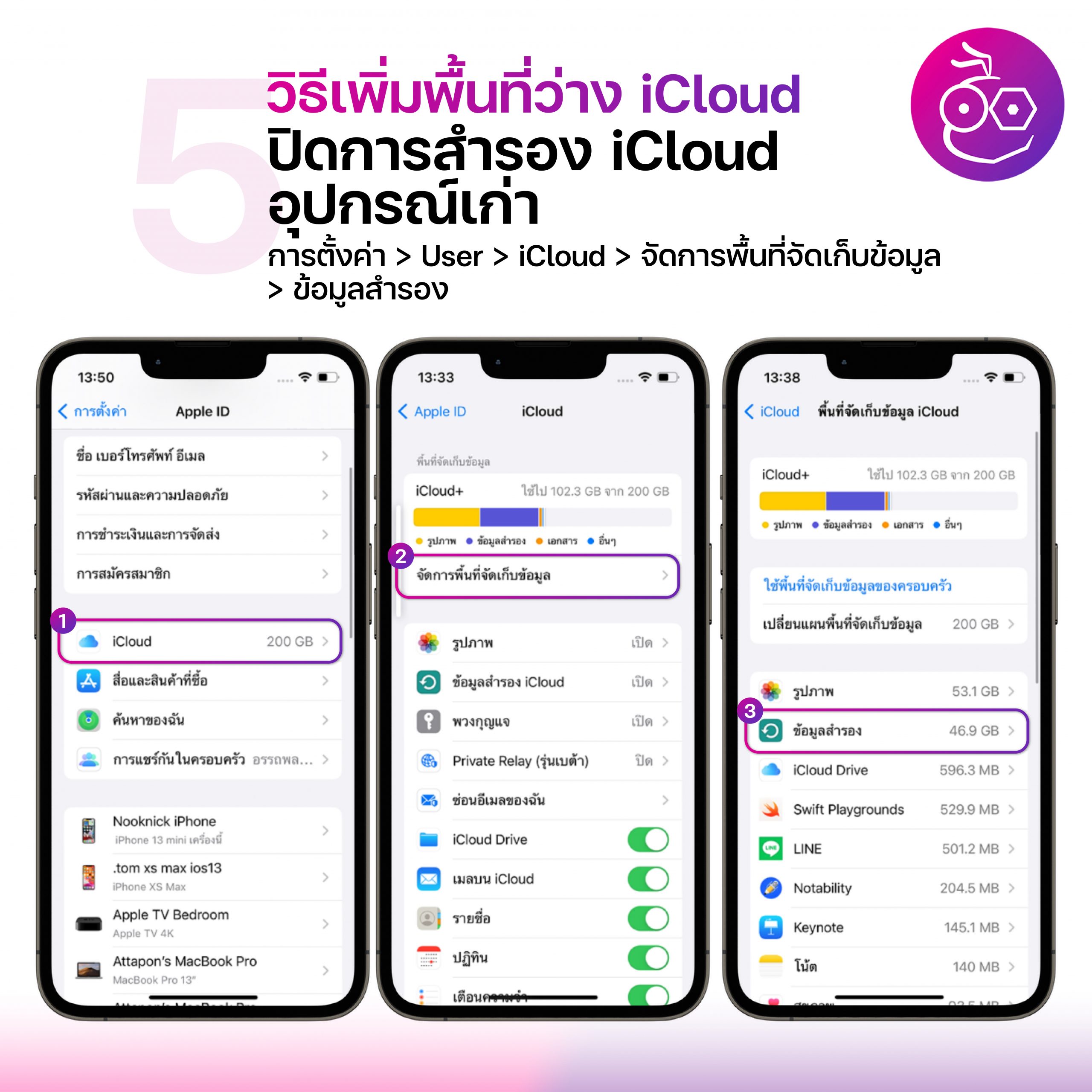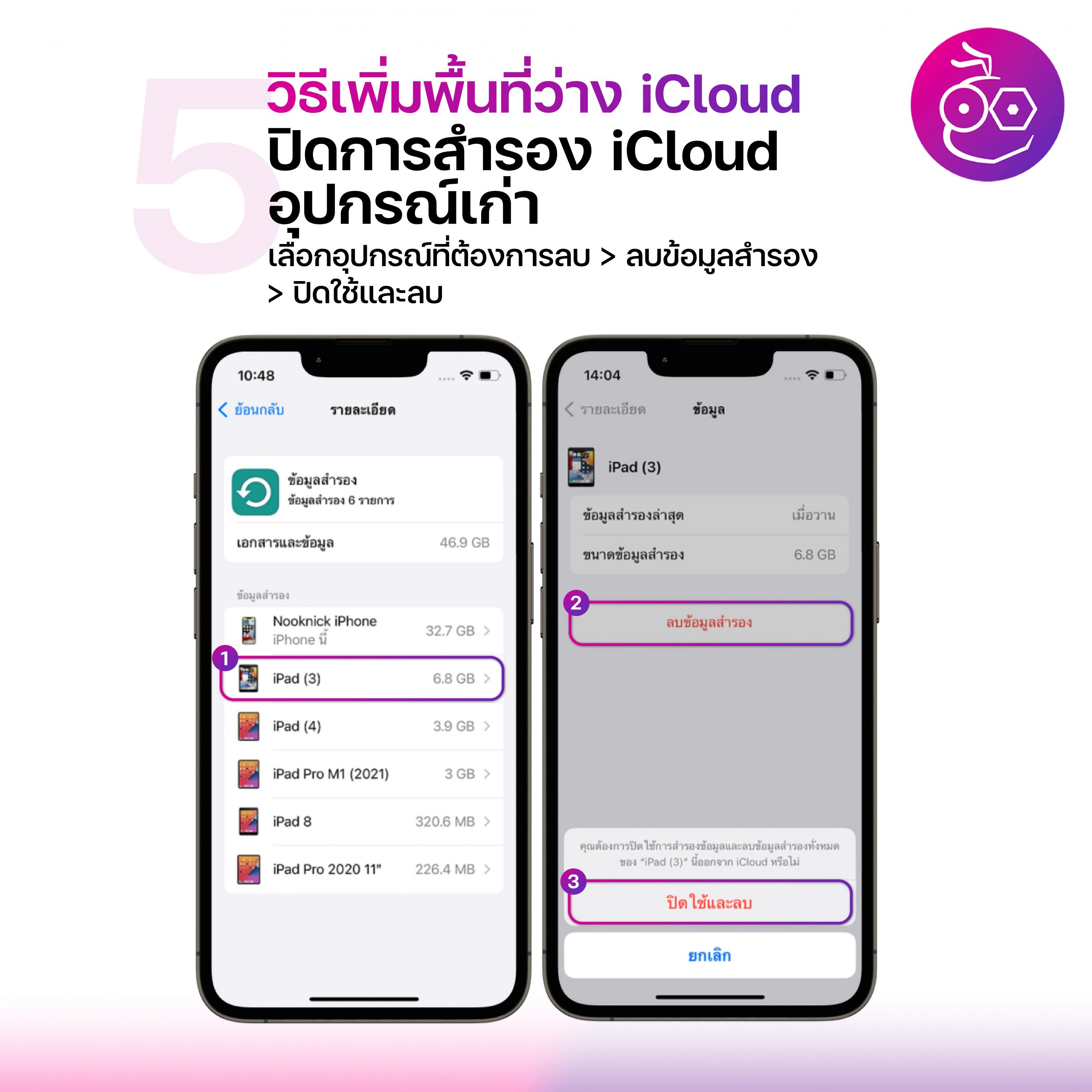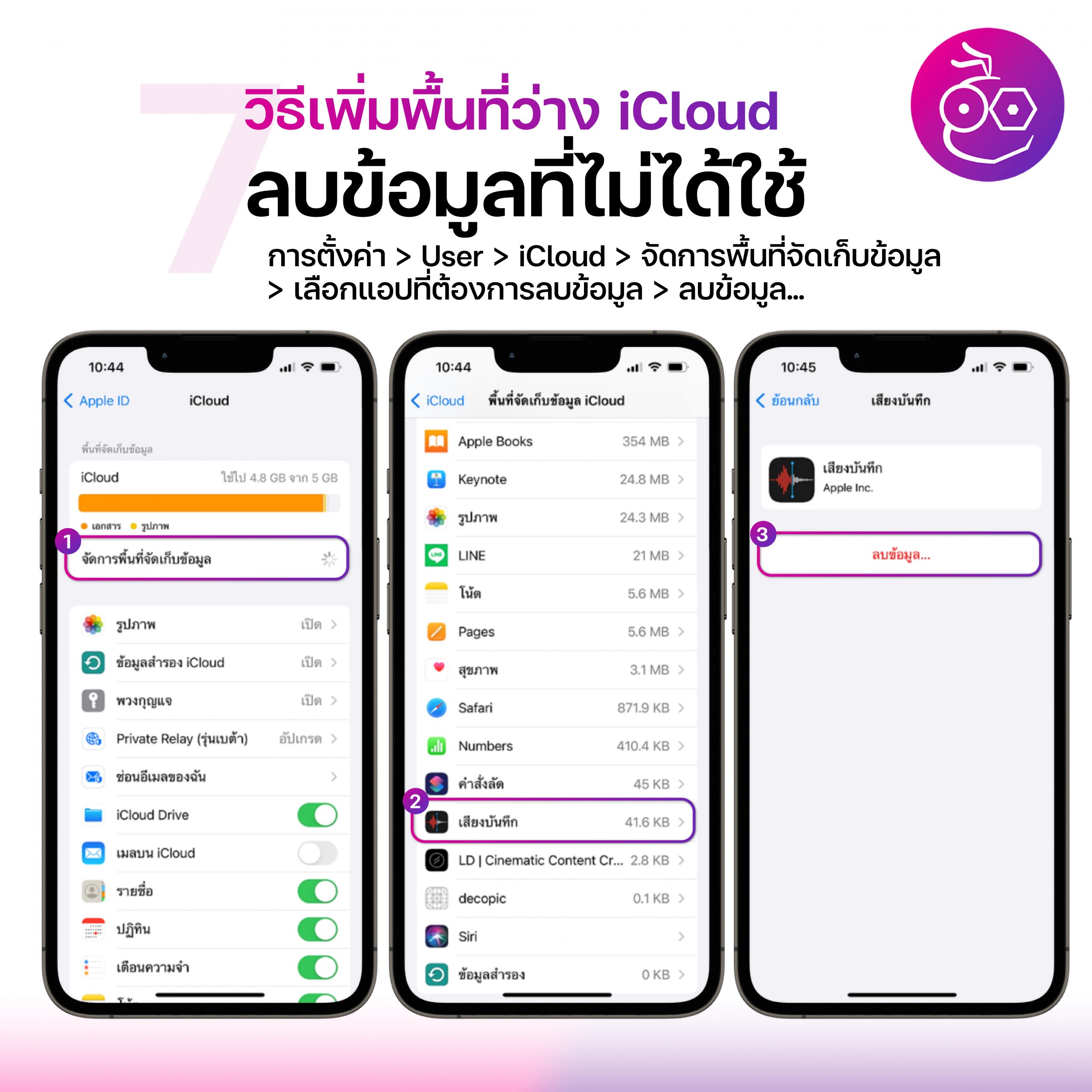 เข้าไปที่ การตั้งค่า > แตะที่ชื่อ User ที่เป็น Apple ID ของเรา > iCloud > จัดการพื้นที่จัดเก็บข้อมูล > เลือกแอบที่ต้องการลบข้อมูล > แตะลบข้อมูล…