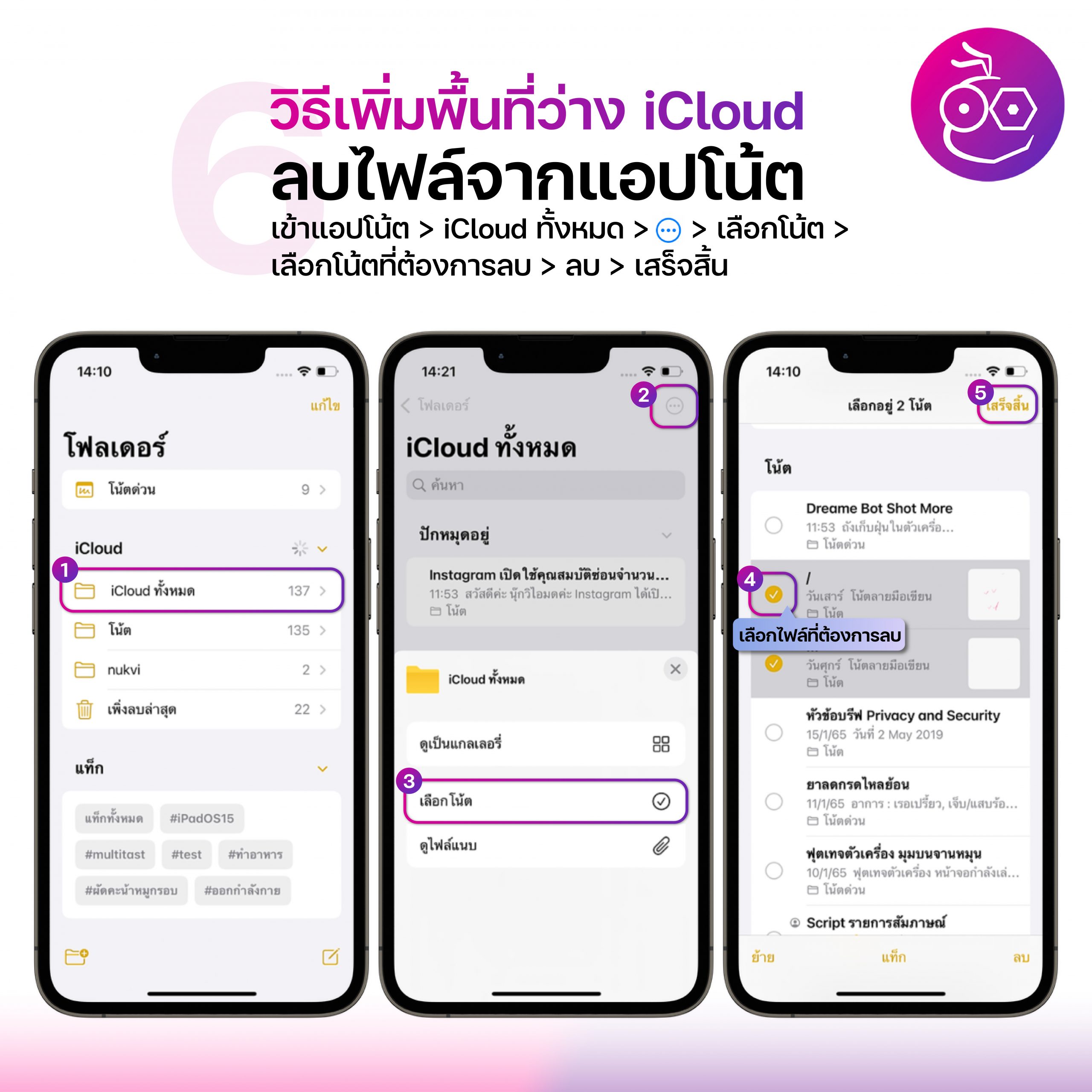 เข้าไปที่แอบโน๊ต > iCloud ทั้งหมด > แตะที่จุดสามจุด > เลือกโน๊ต > เลือกไฟล์ที่ต้องการลบ > ลบ > แตะเสร็จสิ้น