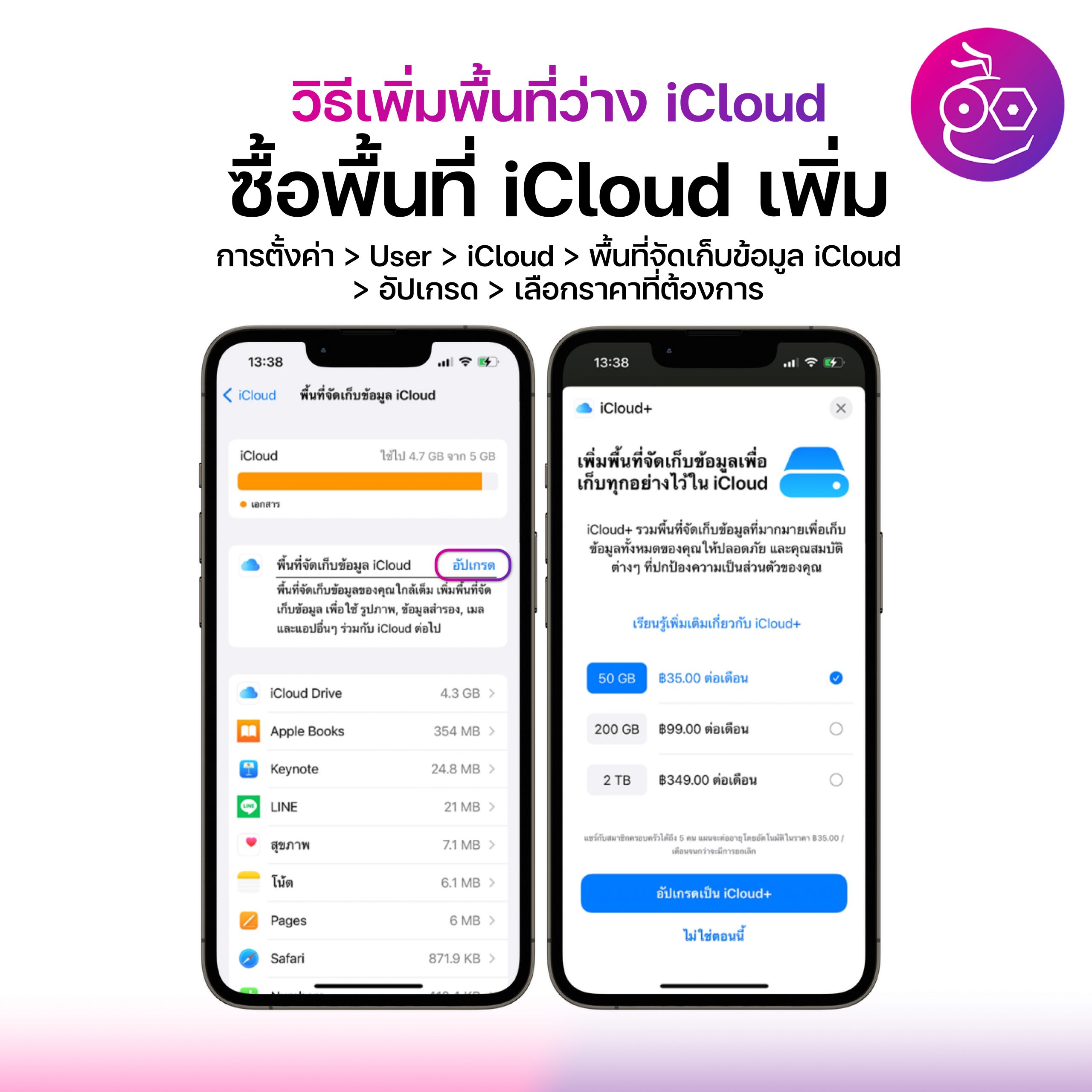 เข้าไปที่ การตั้งค่า > แตะที่ชื่อ User ที่เป็น Apple ID ของเรา > iCloud > พื้นที่จัดเก็บข้อมูล iCloud > อัปเกรด > เลือกซื้อแพ็กเก็จ iCloud ที่ต้องการ