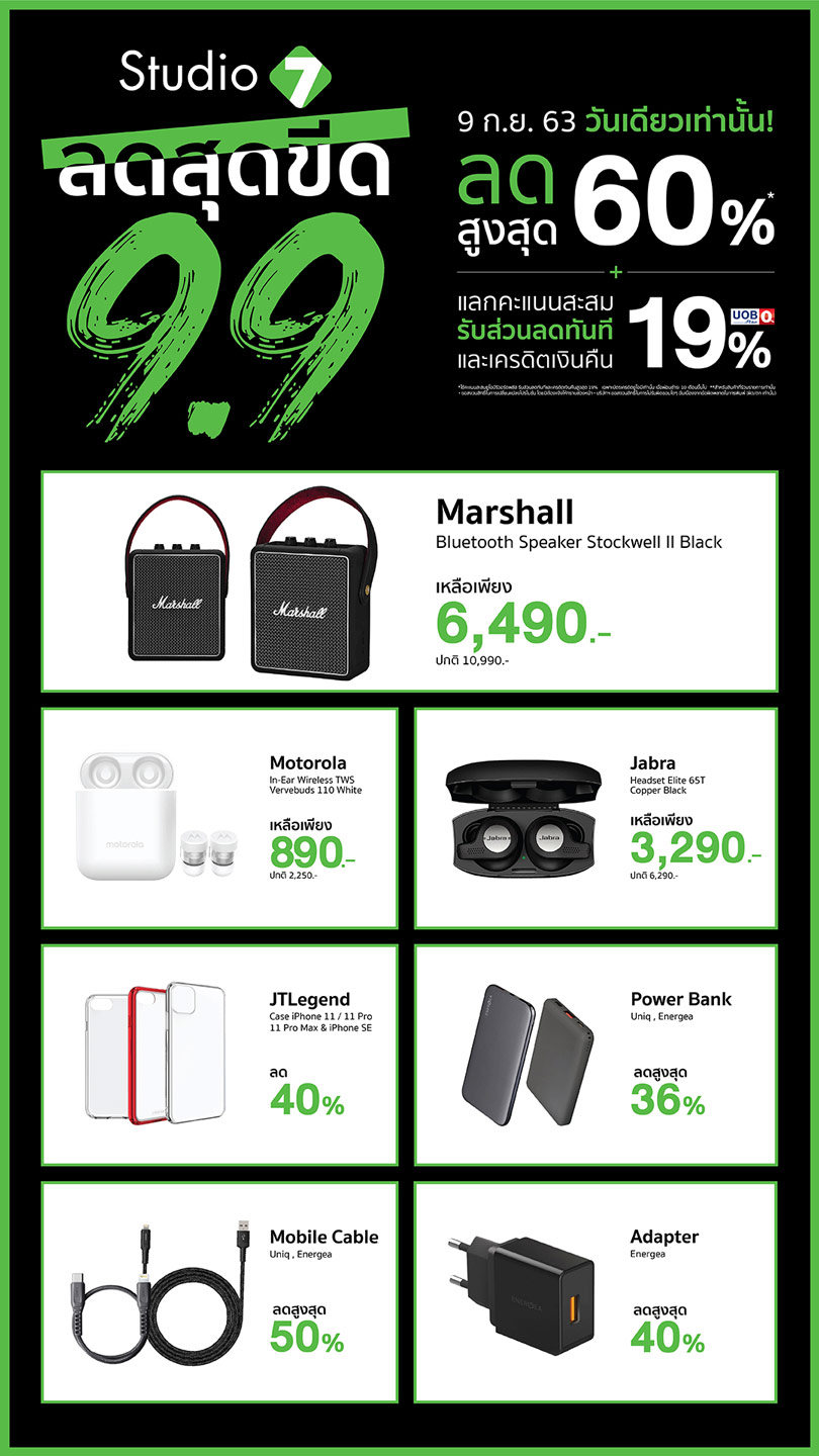 โปรโมชั่นเด็ด ๆ “Studio 7 ลดสุดขีด 9.9” สินค้าในร้านลดสูงสุด 60%* พร้อมแลกคะแนนสะสมรับส่วนลดทันที และรับเครดิตเงินคืน 19% ที่ Studio 7 ใกล้บ้าน 9 ก.ย. 63 วันเดียวเท่านั้น