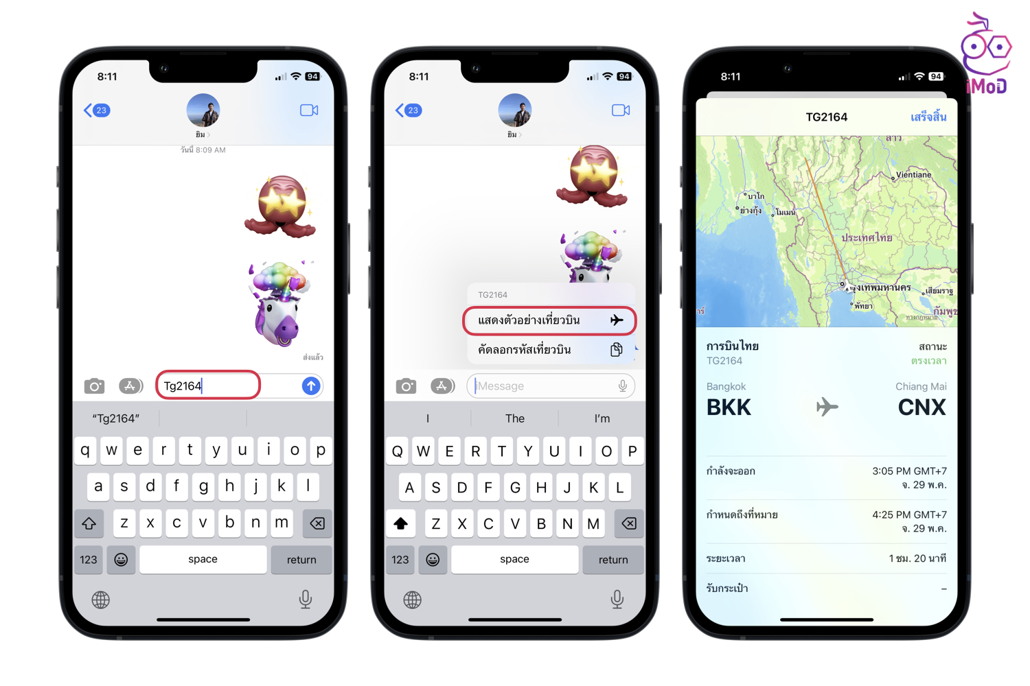 นอกจากนี้ ในแอป iMessage ยังสามารถดูเที่ยวบินได้ด้วยเช่นกัน เพียงแค่พิมพ์หมายเลขเที่ยวบินในช่องข้อความและแตะส่ง จากนั้นก็แตะหมายเลขเที่ยวบิน แล้วเลือกแสดงตัวอย่างเที่ยวบิน