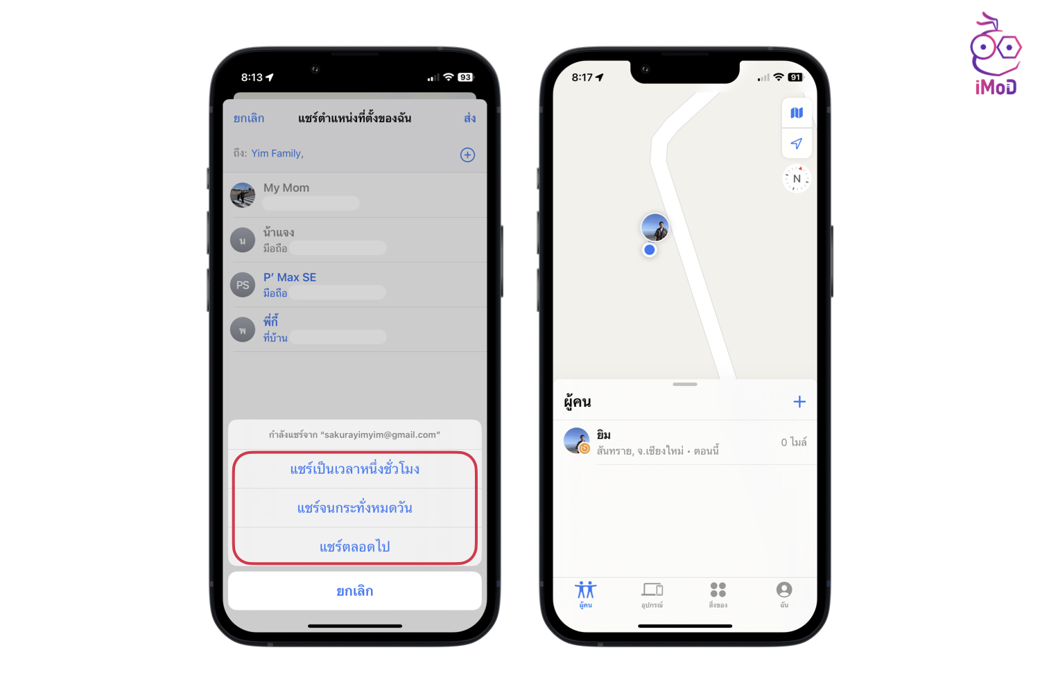 เลือกว่าจะแชร์เป็นเวลาเท่าไหร่ > หลังจากที่ฝั่งรับการแชร์ตอบรับแล้ว พวกเขาก็จะเห็นว่าเราอยู่ตำแหน่งใด และถ้าหากพวกเขาแชร์ตอบ เราก็จะเห็นตำแหน่งของพวกเขาด้วย ทำให้ตามหากันได้ง่ายมากขึ้น