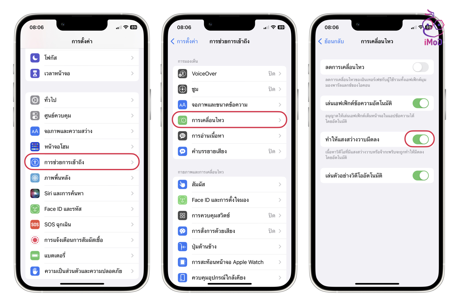 ตั้งค่าเปิดใช้งานได้ที่ การตั้งค่า (Settting) > การช่วยการเข้าถึง (Accessibility) > การเคลื่อนไหว (Motion) > เปิด ทำให้แสงสว่างวาบมือมือลง (Dim Flashing Lights)