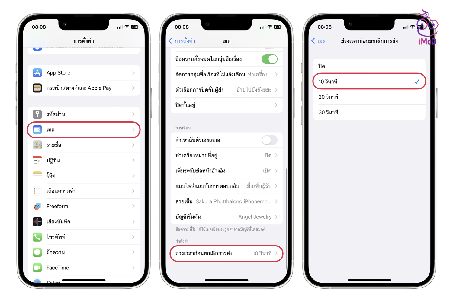 ไปที่ การตั้งค่า (Settings) > เมล (Mail) > ช่วงเวลาก่อนยกเลิกการส่ง (Undo Send Delay) > แตะเลือกเวลาที่ต้องการ