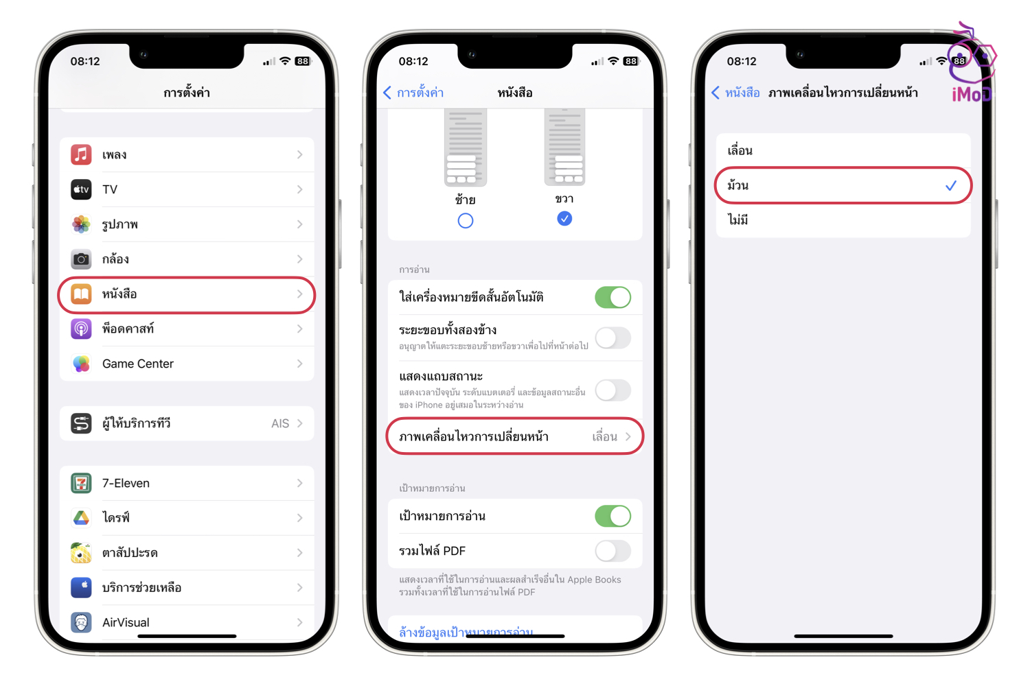 ไปที่ การตั้งค่า (Settings) > หนังสือ (Books) > ภาพเคลื่อนไหวการเปลี่ยนหน้าจอ (Page Turn Animation.) > เลือกแบบม้วน (Curl)