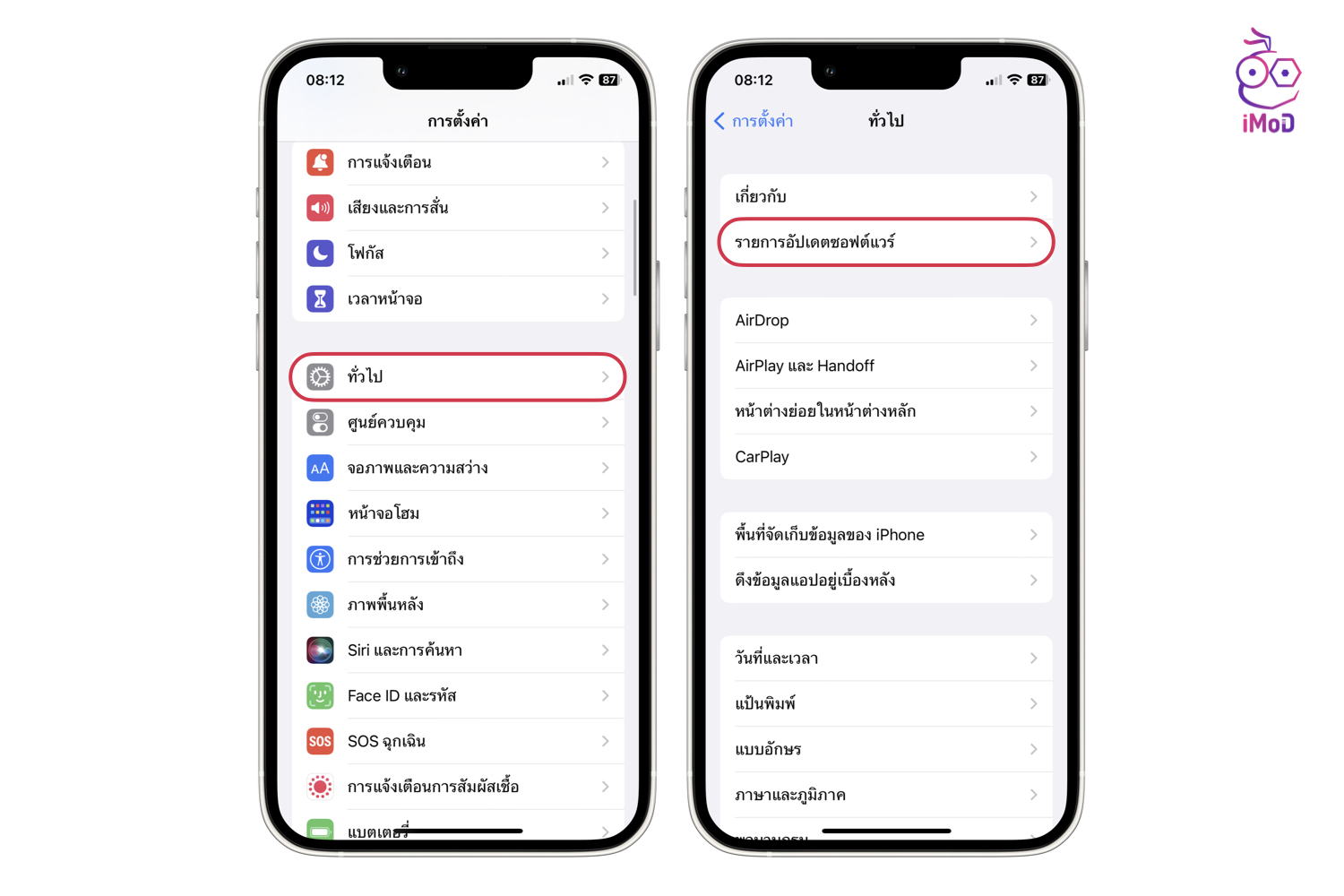 ไปที่ การตั้งค่า (Settings) > ทั่วไป (General) > รายการอัปเดตซอฟต์แวร์ (Software Update)