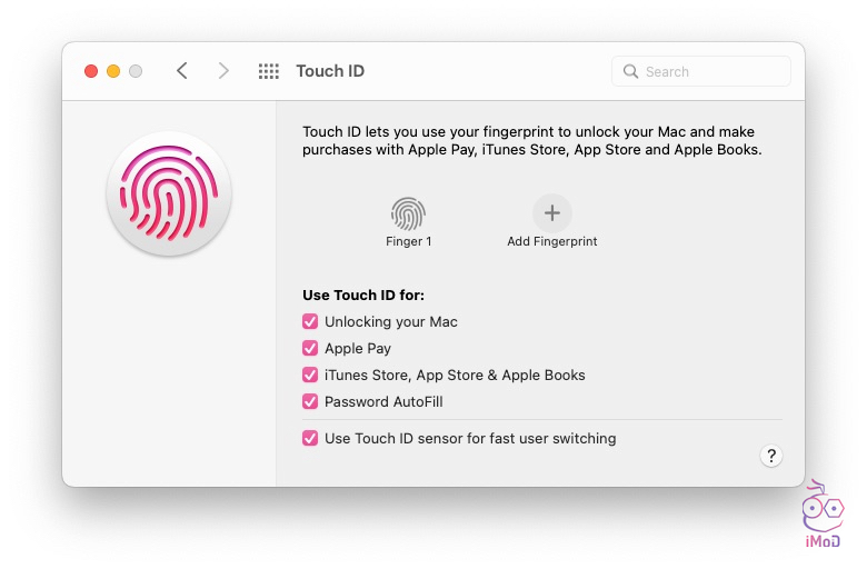 เลือกตั้งค่าการสแกนนิ้ว หรือถ้าหากเข้าได้หลายคนก็แตะเพิ่มลายนิ้วมือได้ จากนั้นก็ตั้งค่าการใช้งาน Touch ID ด้านล่าง ว่าจะใช้ยืนยันอะไรได้บ้าง เช่น ปลดล็อเครื่อง Mac, สแกนการดาวน์โหลดเนื้อหา, ยืนยันการกรอกรหัสผ่าน AutoFill