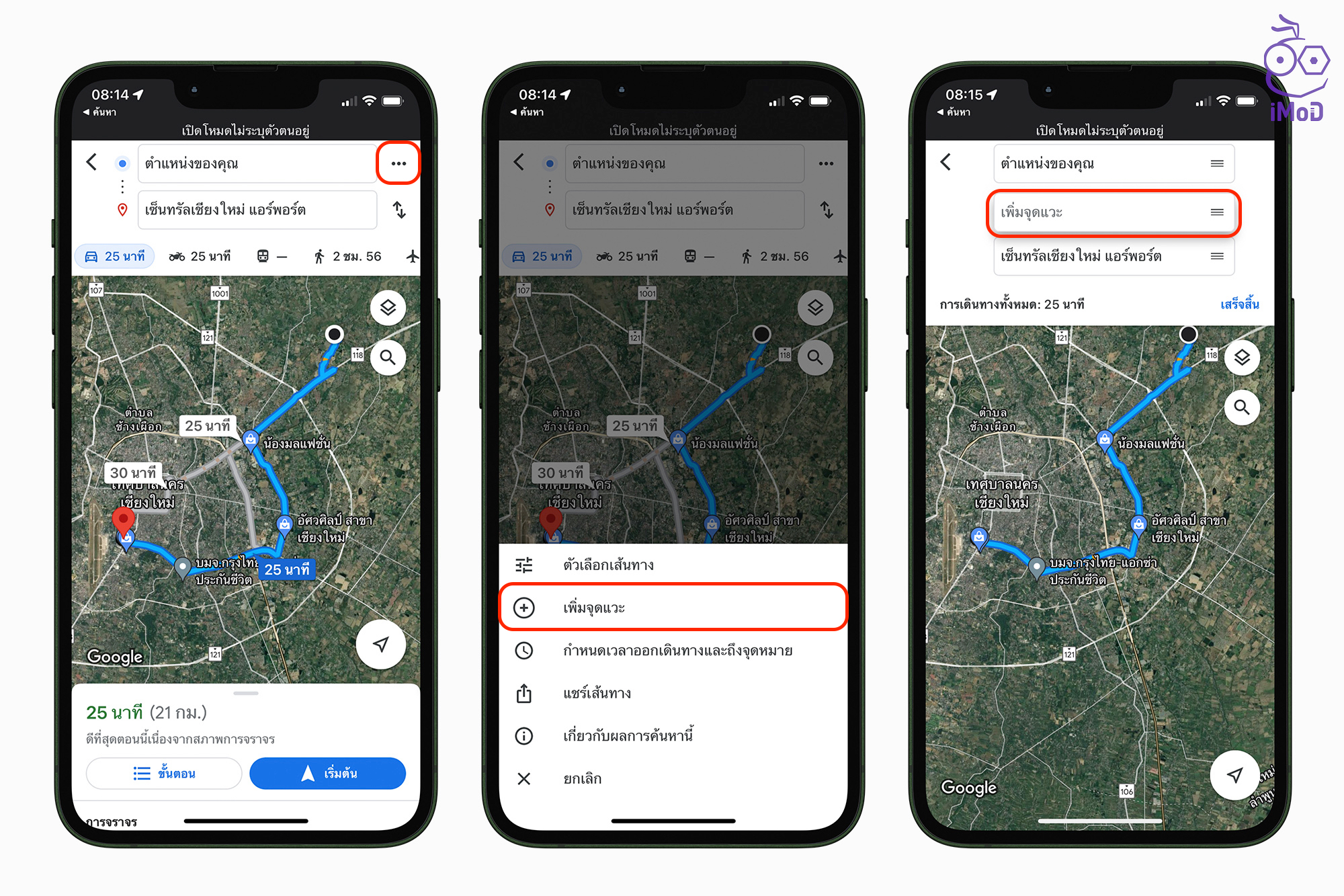 เปิดแอป Google Maps และเลือกที่ตำแหน่งปลายทางที่ต้องการไป > แตะไอคอน 3 จุด มุมบนขวา > แตะ เพิ่มจุดแวะ > ใส่ข้อมูลจุดแวะพัก และสามารถแตะไอคอน 2 ขีด แล้วเลื่อน เพื่อจัดลำดับ