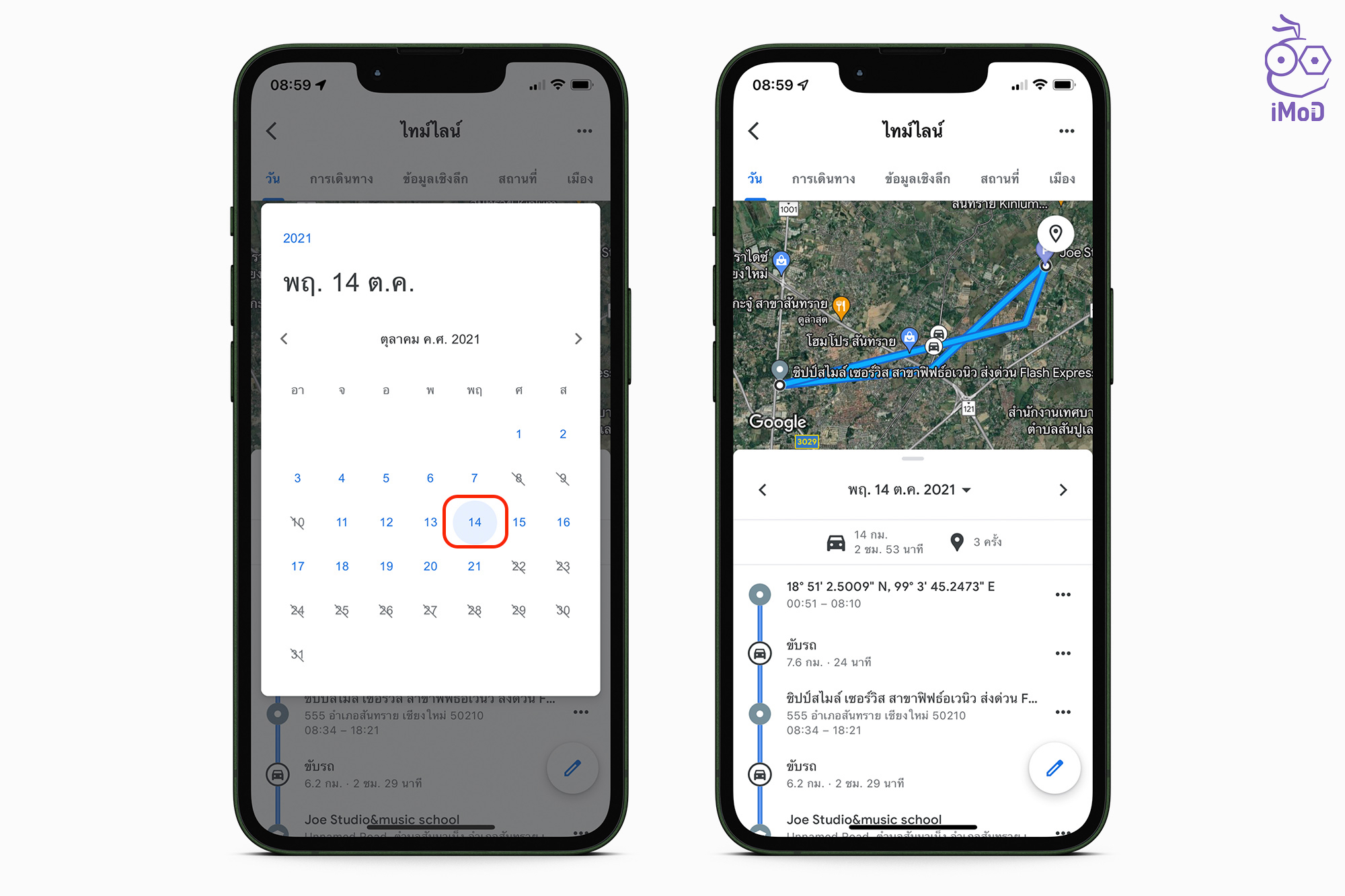 เลือกวันที่ที่ต้องการดูย้อนหลัง > แอปก็จะแสดงไทม์ไลน์การเดินทางของเราในวันที่เราเลือก