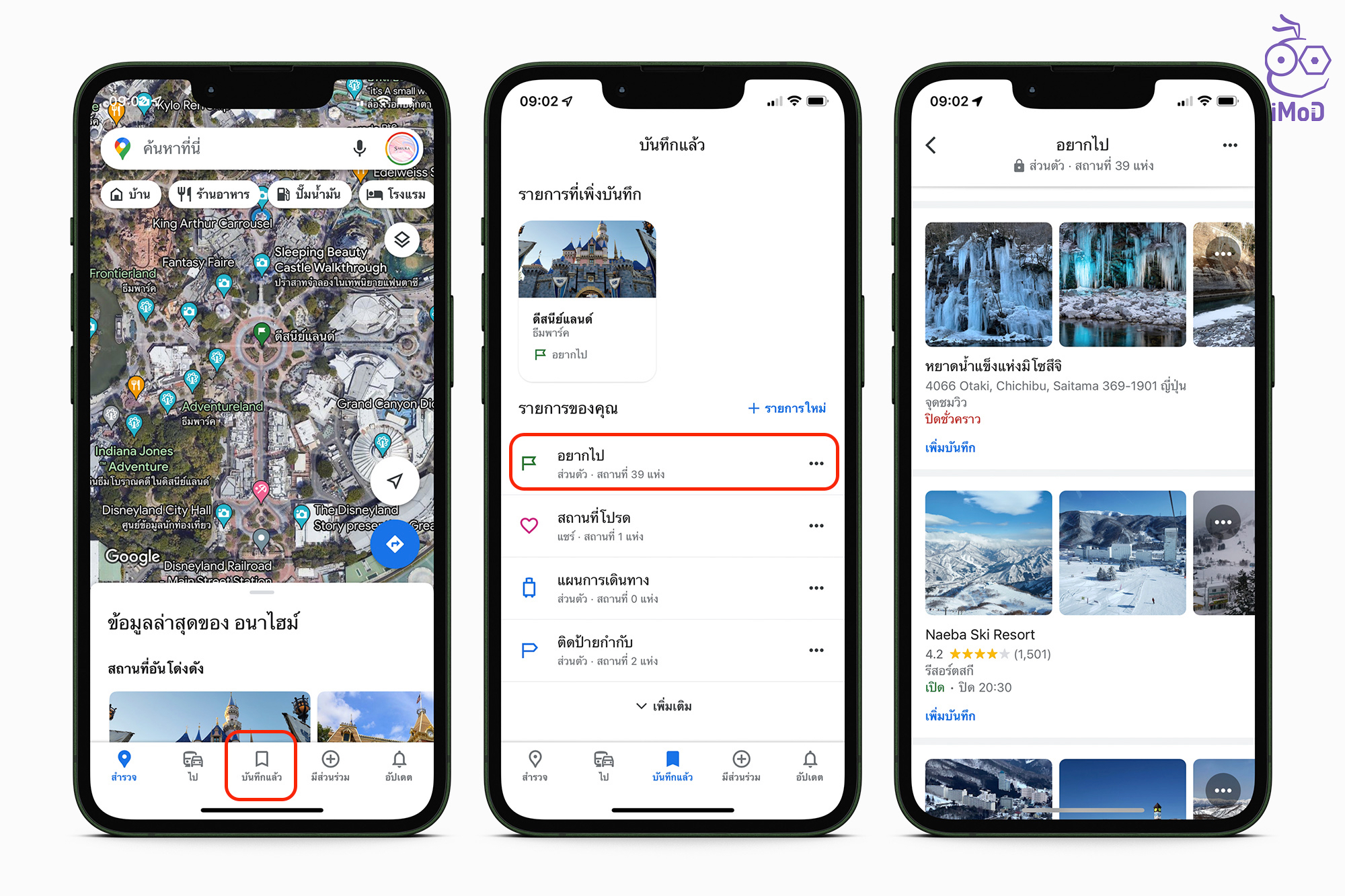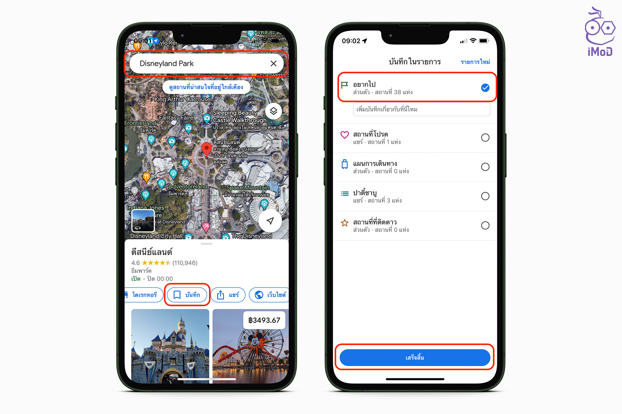 ค้นหาสถานที่ที่เราอยากไป จากนั้นเลือก บันทึก > แตะเลือก อยากไป > เสร็จสิ้น