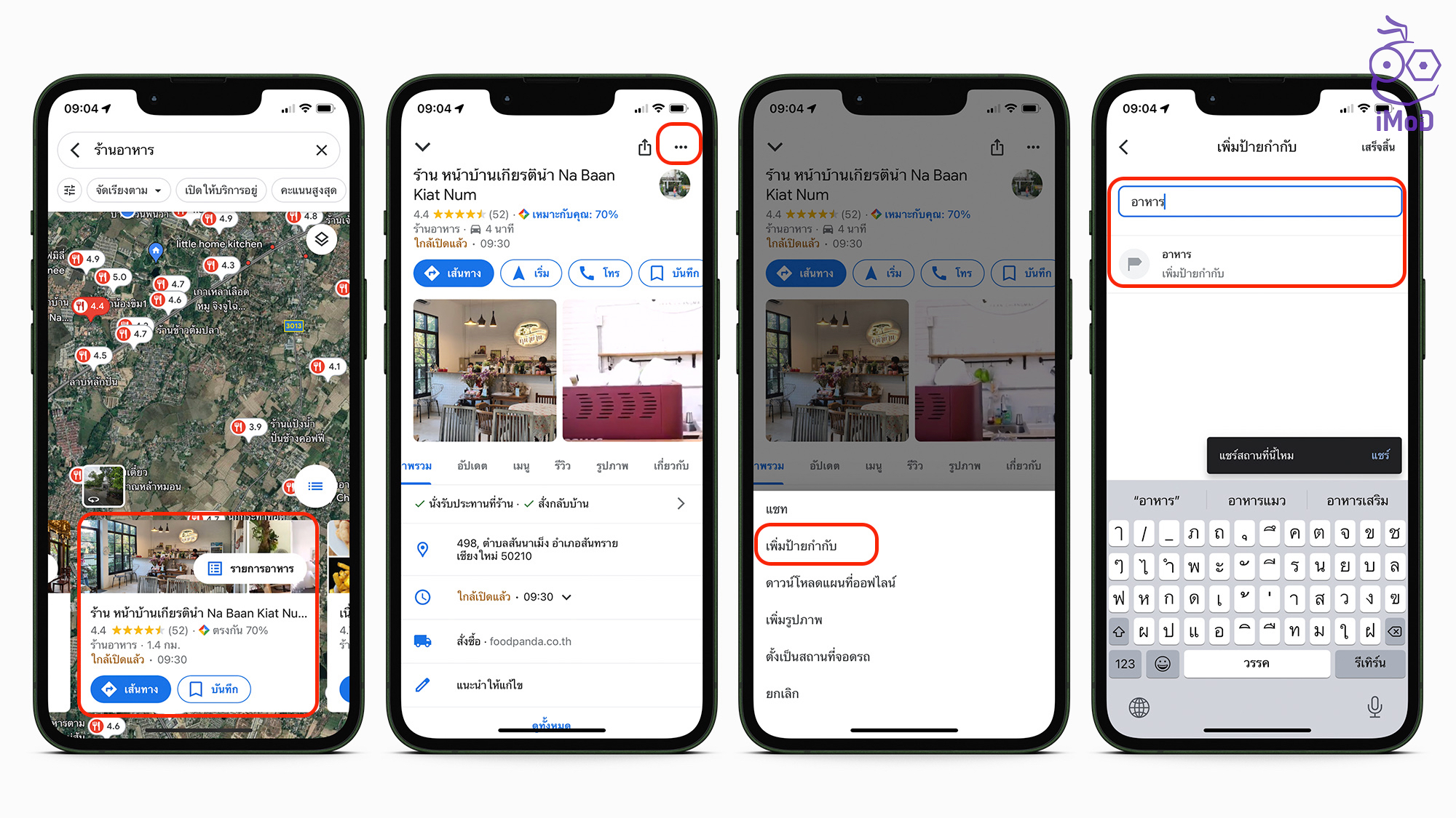 ค้นหาสถานที่ที่ต้องการ แล้วที่ข้อมูล > แตะไอคอน 3 จุด มุมขวาบน > เพิ่มป้ายกำกับ > พิมพ์ชื่อป้ายกำกับที่เกี่ยวข้อง