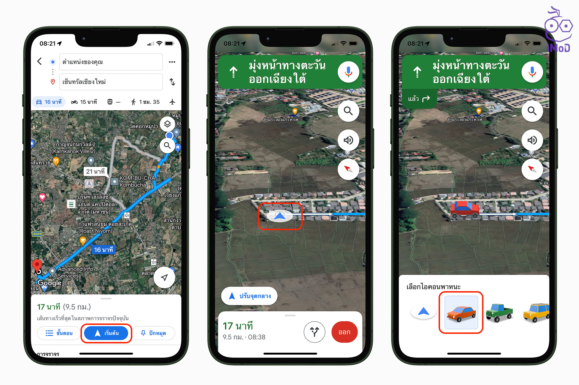 ปกติแล้วไอคอนการนำทางของ Google Maps จะแสดงเป็นลูกศรสีฟ้า เราสามารถเพิ่มสีสันการเดินทางได้มากขึ้น ด้วยการเปลี่ยนไอคอนการนำทางให้เป็นรูปรถยนต์ที่มีหลายสีให้เลือก