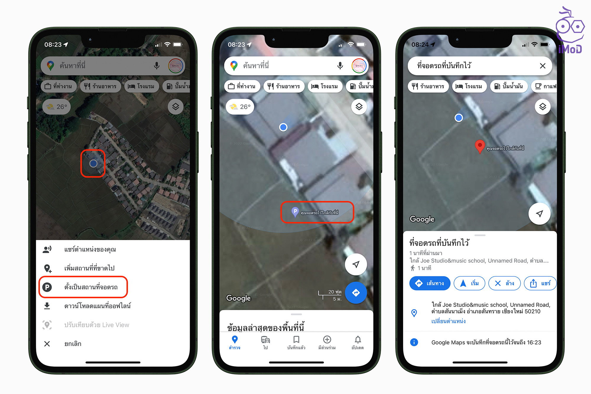 เมื่อเราอยู่ที่สถานที่จอดรถ ให้แตะไอคอนที่ตั้งสีฟ้า > เลือก ตั้งเป็นสถานที่จอดรถ > แผนที่ก็จะบันทึกเป็นที่จอดรถให้ เมื่อเราไปที่อื่น และต้องการนำทางกลับมายังที่จอดรถ ก็แตะแตที่จอดรถแล้วเริ่มนำทางได้เลย